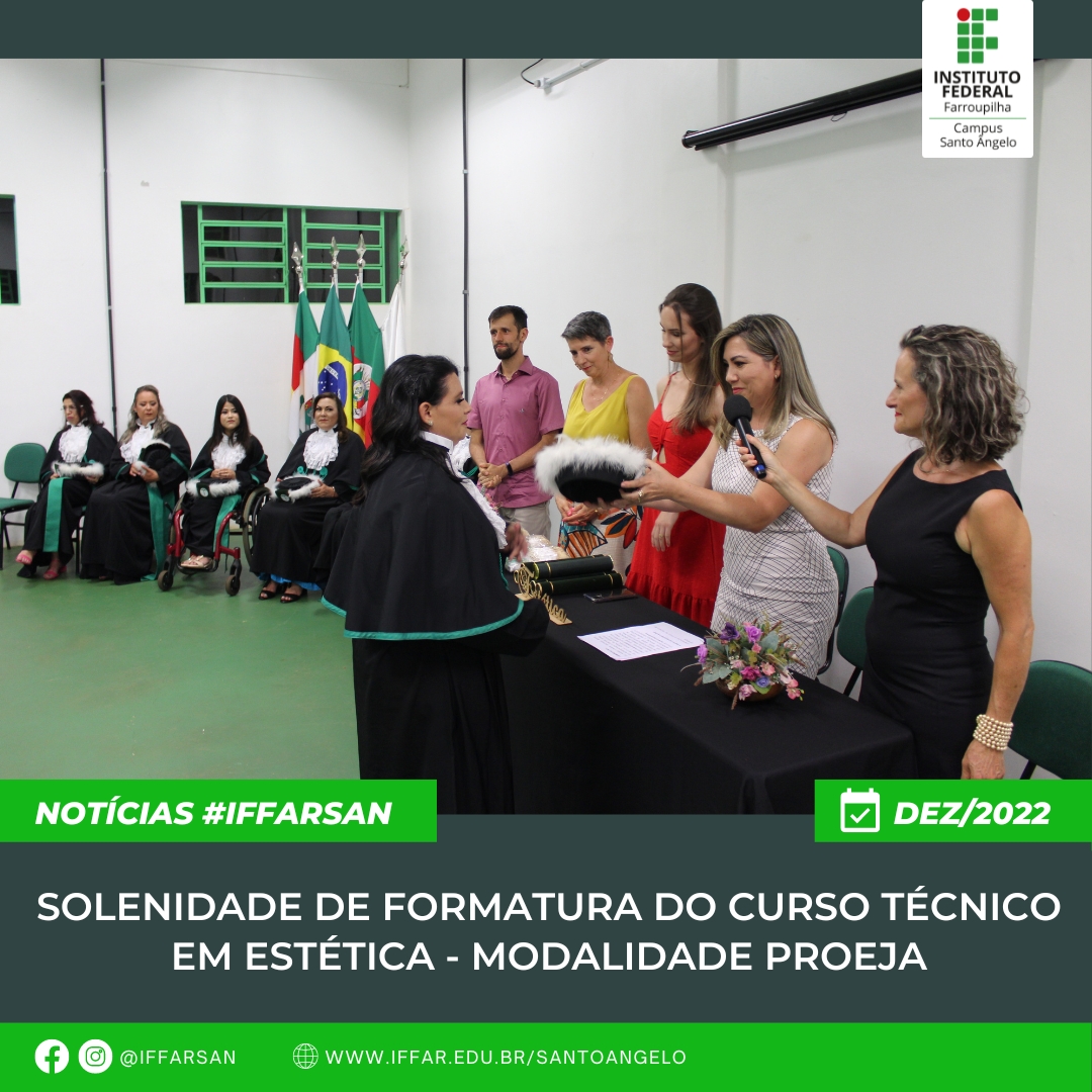 Tendo como público Jovens e adultos que não tiveram a oportunidade de cursar o ensino médio na idade regular e que buscam também uma profissionalização, realizou-se no dia 22 de dezembro de 2022 a solenidade de formatura do Curso Técnico em Estética, do Programa Nacional de Integração da Educação Básica com a Educação Profissional na Modalidade de Educação de Jovens e Adultos (PROEJA).