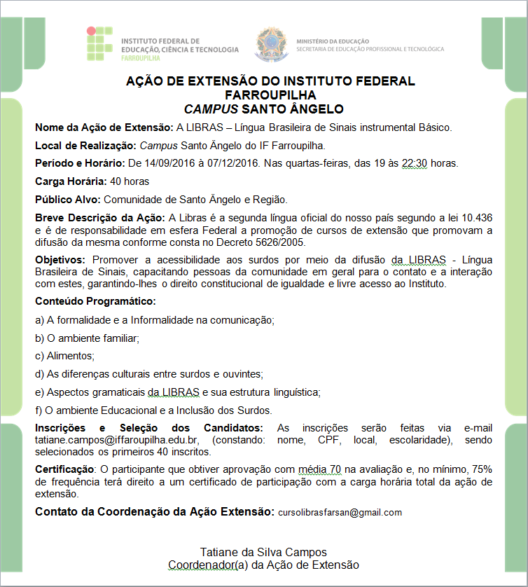 Breve Descrição da Ação: A Libras é a segunda língua oficial do nosso país segundo a lei 10.436 e é de responsabilidade em esfera Federal a promoção de cursos de extensão que promovam a difusão da mesma conforme consta no Decreto 5626/2005.
