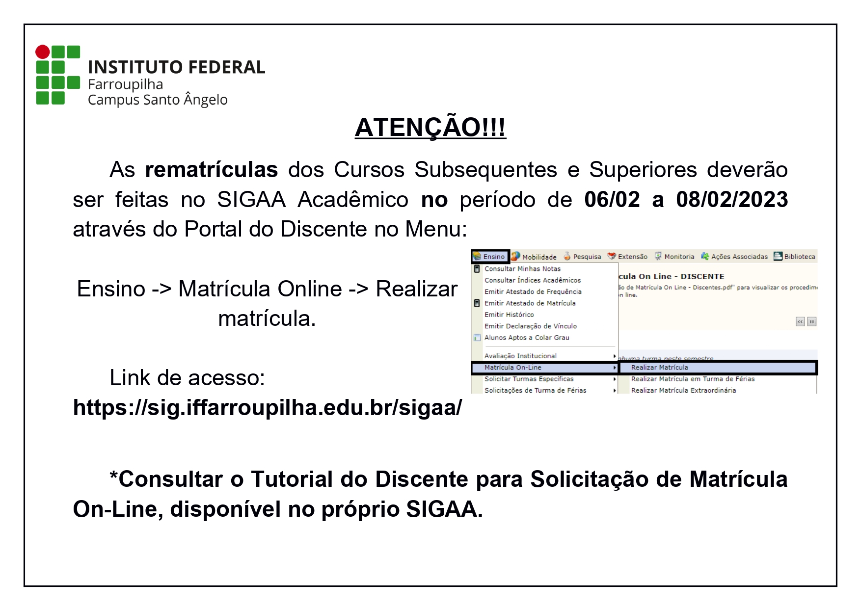 As rematrículas dos Cursos Subsequentes e Superiores deverão ser feitas no SIGAA Acadêmico no período de 06/02 a 08/02/2023 através do Portal do Discente no Menu: