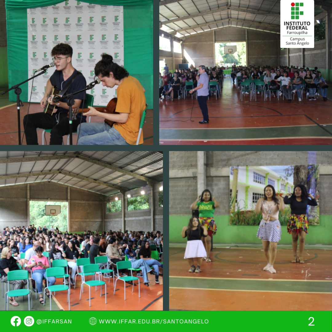 Pela manhã, foram recepcionadas as turmas dos segundos e terceiros anos dos cursos técnicos integrados ao ensino médio. No turno da noite, foram acolhidas as turmas de veteranos dos Cursos Superiores de Tecnologia em Gestão do Agronegócio, Sistemas para Internet, Estética e Cosmética e Licenciatura em Computação, bem com os ingressantes e veteranos do curso técnico em enfermagem e Proeja Estética.