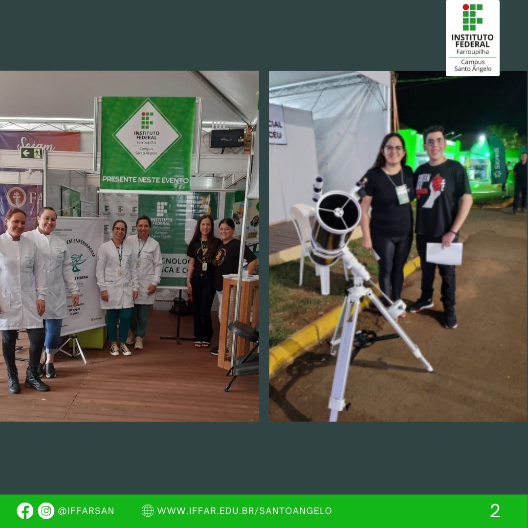 Tivemos também a divulgação dos projetos de pesquisa e extensão desenvolvidos pelo Campus de Santo Ângelo. Na oportunidade a Professora Karlise Soares Nascimento e o aluno Luís Eduardo de Quadra, da turma de ensino médio integrado em informática, bolsista do Laboratório Maker, apresentaram o Projeto de Extensão do Clube de Astronomia realizando a atividade de Observação da Lua, os mesmos usaram um telescópio Toya de 150mm, com montagem equatorial, que foi adquirido recentemente por emenda parlamentar.