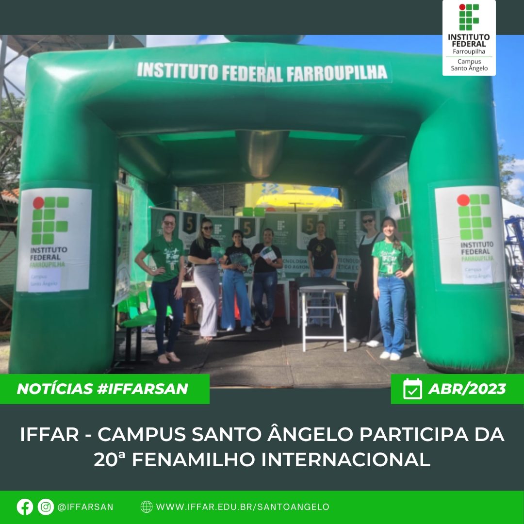 De 21 a 30 de abril de 2023, o IFFar - Campus Santo Ângelo participa da 20ª Edição da Feira Internacional do Milho (Fenamilho), no Parque Internacional de Exposições Siegfried Ritter, de Santo Ângelo. A Feira tem como objetivo divulgar as potencialidades socioeconômicas de Santo Ângelo, tornando-se a vitrine de produtos e novas tecnologias, além de fomentar a cultura e proporcionar o lazer às pessoas.