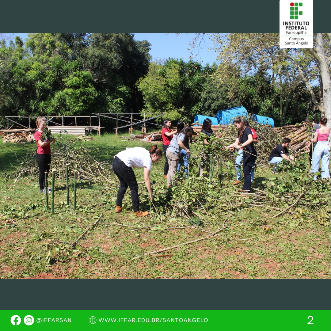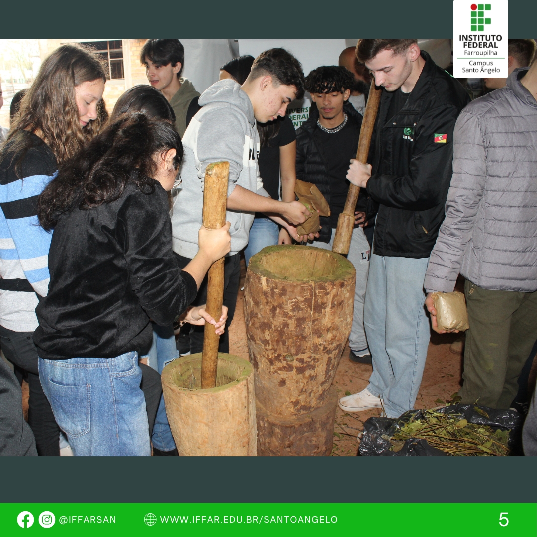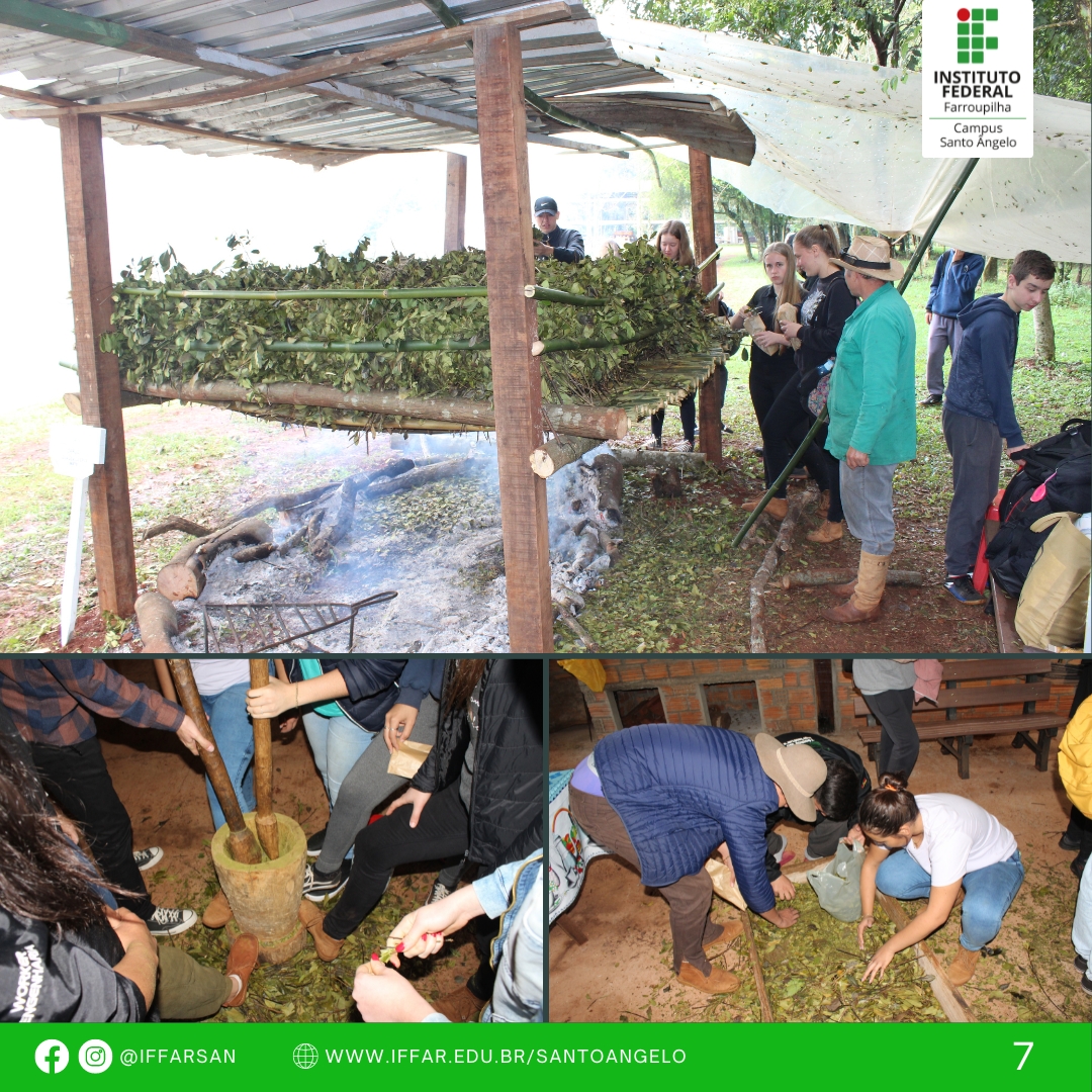 O processo de produção de erva-mate envolveu alunos do Campus e visitantes, desde a colheita da planta, o sapeco, a formação dos macacos, a secagem no carijo, o cancheamento e, por fim, a pilagem da erva e o sorver do chimarrão com a erva-mate produzida. Esses momentos são vivenciados com muita alegria por parte dos alunos, em especial dos cursos técnicos integrados.