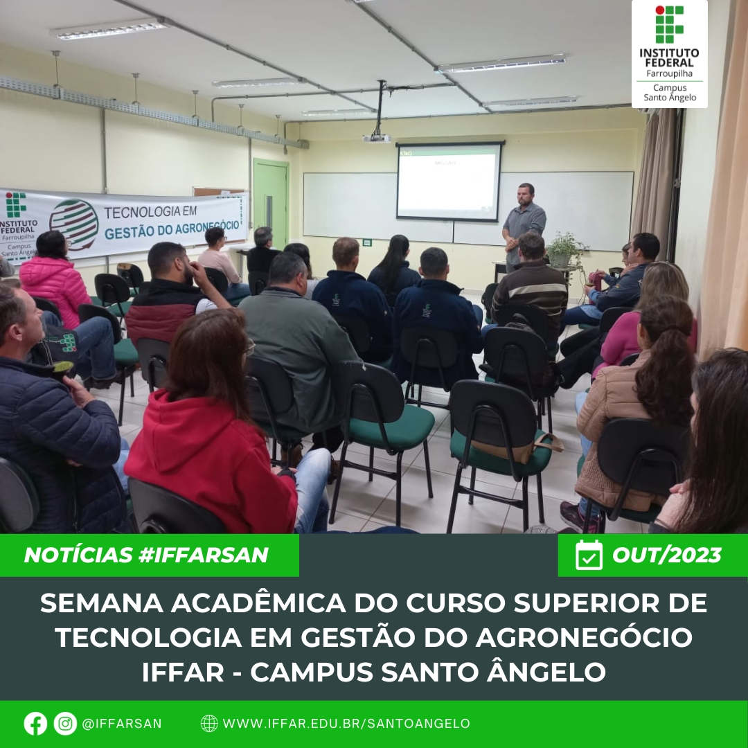 De 04 a 06 de outubro/2023, foi realizada a semana acadêmica do Curso Superior de Tecnologia em Gestão do Agronegócio do Campus Santo Ângelo que propiciou aos alunos e demais participantes, agregar conhecimentos da área com profissionais altamente qualificados.