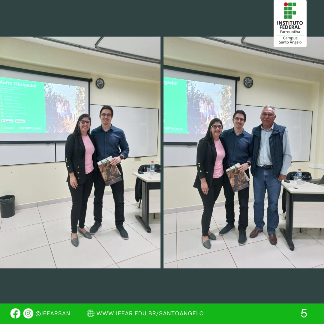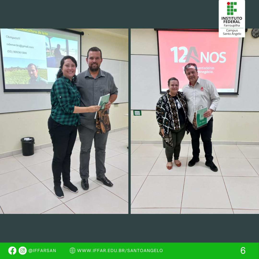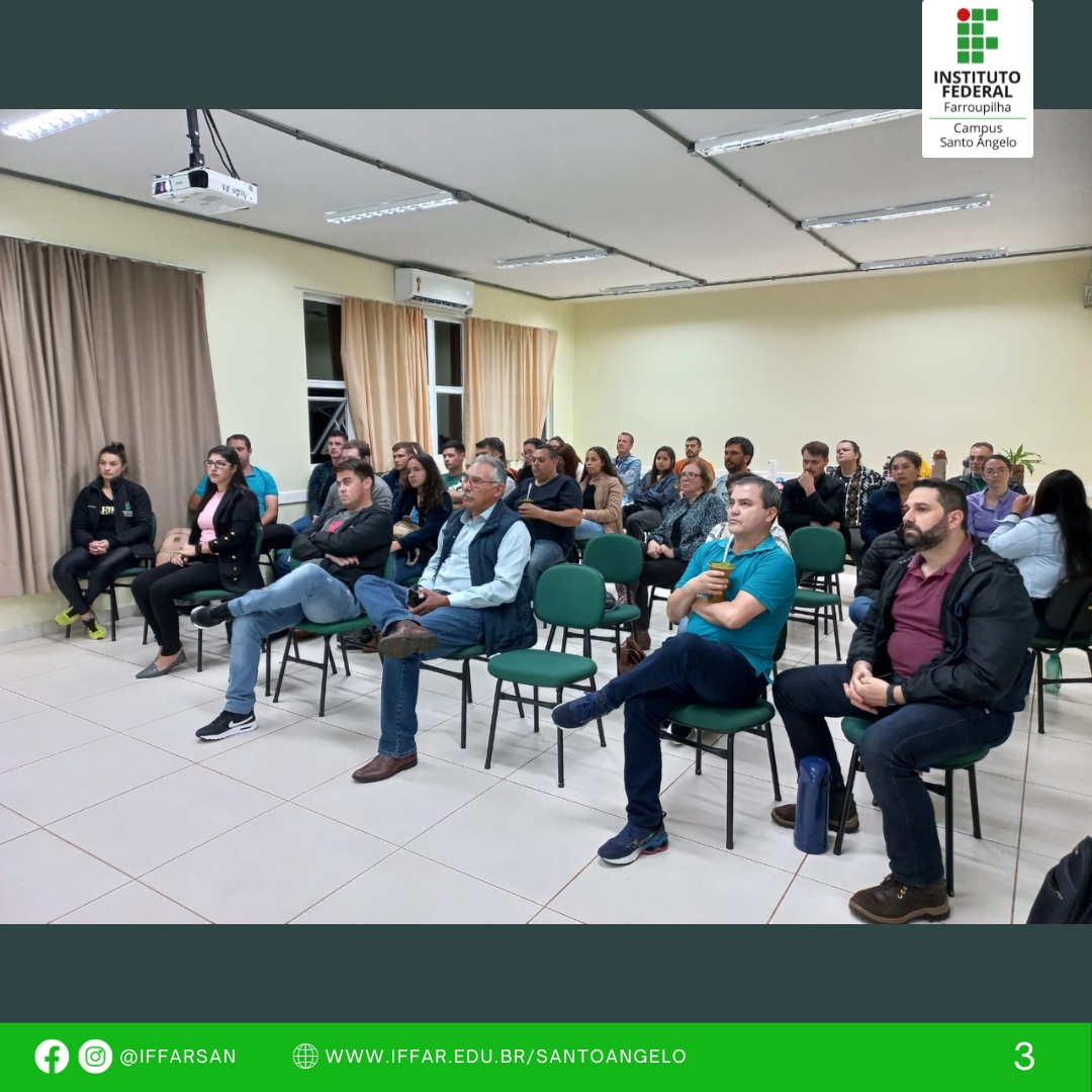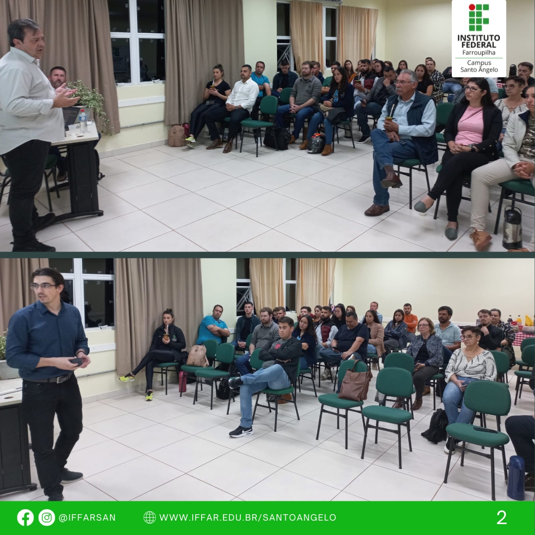 No dia 04/10, Palestra: Educação Sanitária em Produtos de Origem Animal, com o Ms. Ântoni Nerone de Aguiar Sartori que é Mestre em Gestão Estratégica das Organizações e Fiscal Sanitário – Coordenador do Serviço de Inspeção Municipal de Santo Ângelo, e