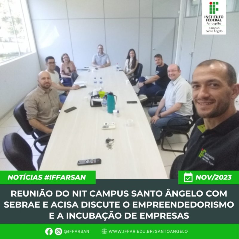 Consideramos oportuno contar com as duas entidades ligadas diretamente à área de empreendedorismo e inovação, para aproximar relações e trilhar passos para o futuro. Na reunião foram apontadas as iniciativas internas ligadas a empreendedorismo, como a mostra empreendedora, o IF Maker, a feira de ciências e o Bye Bye Boss, como exemplos de atividades que podem estimular o desenvolvimento da cultura empreendedora no campus.