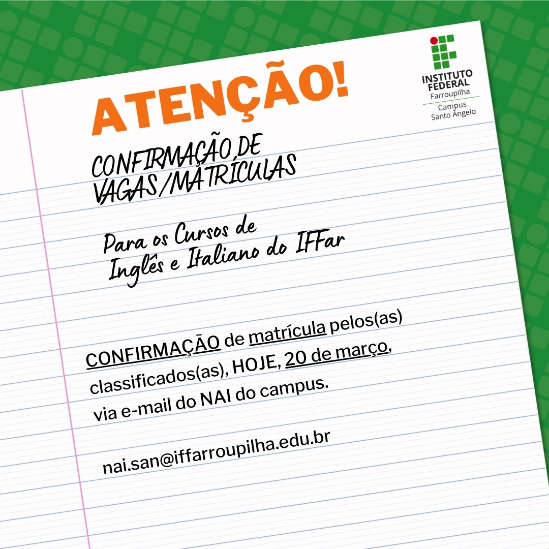 CONFIRMAÇÃO de matrícula pelos(as) classificados(as), HOJE, 20 de março, via e-mail do NAI do campus: