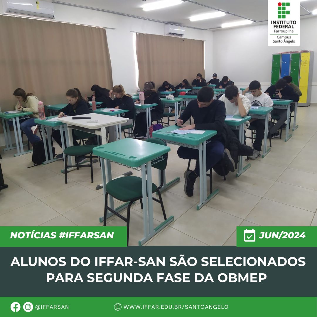 No dia 04 de junho de 2024 os alunos do IFFar - Campus Santo Ângelo participaram da 1º fase da Olimpíada Brasileira de Matemática das Escolas Públicas (OBMEP). A partir dessa prova foram selecionados 19 alunos que representarão a instituição na 2ª fase, que acontecerá no dia 04 de outubro de 2024.