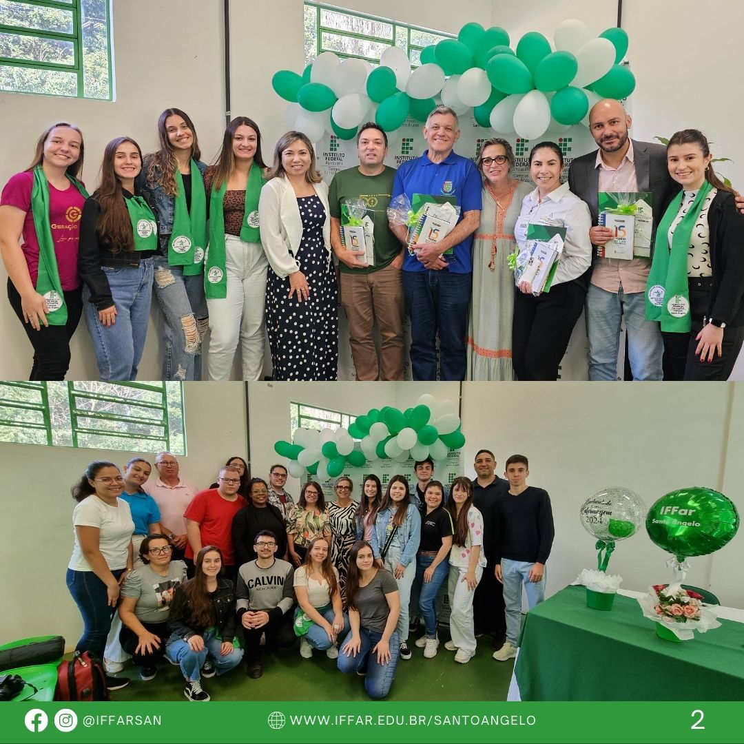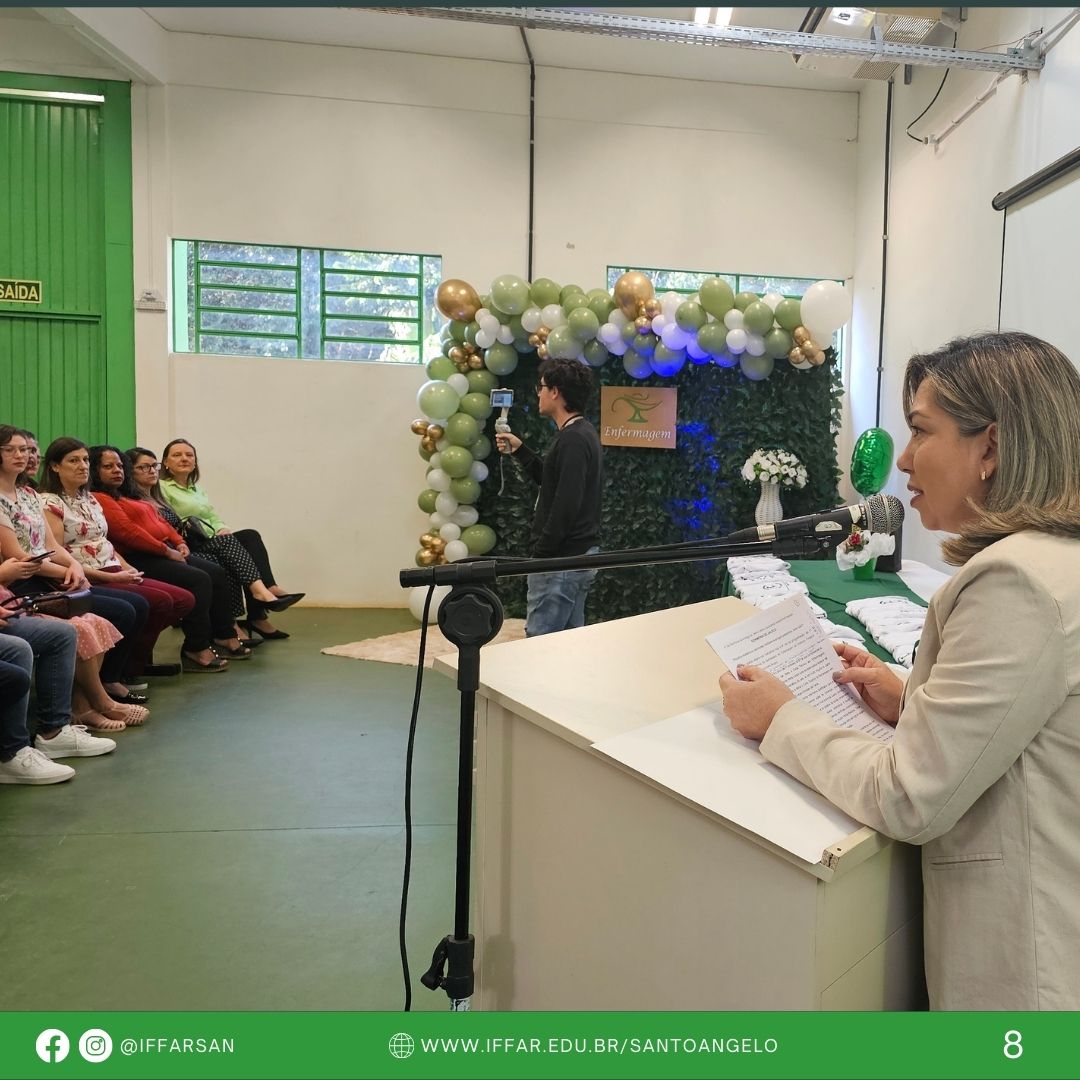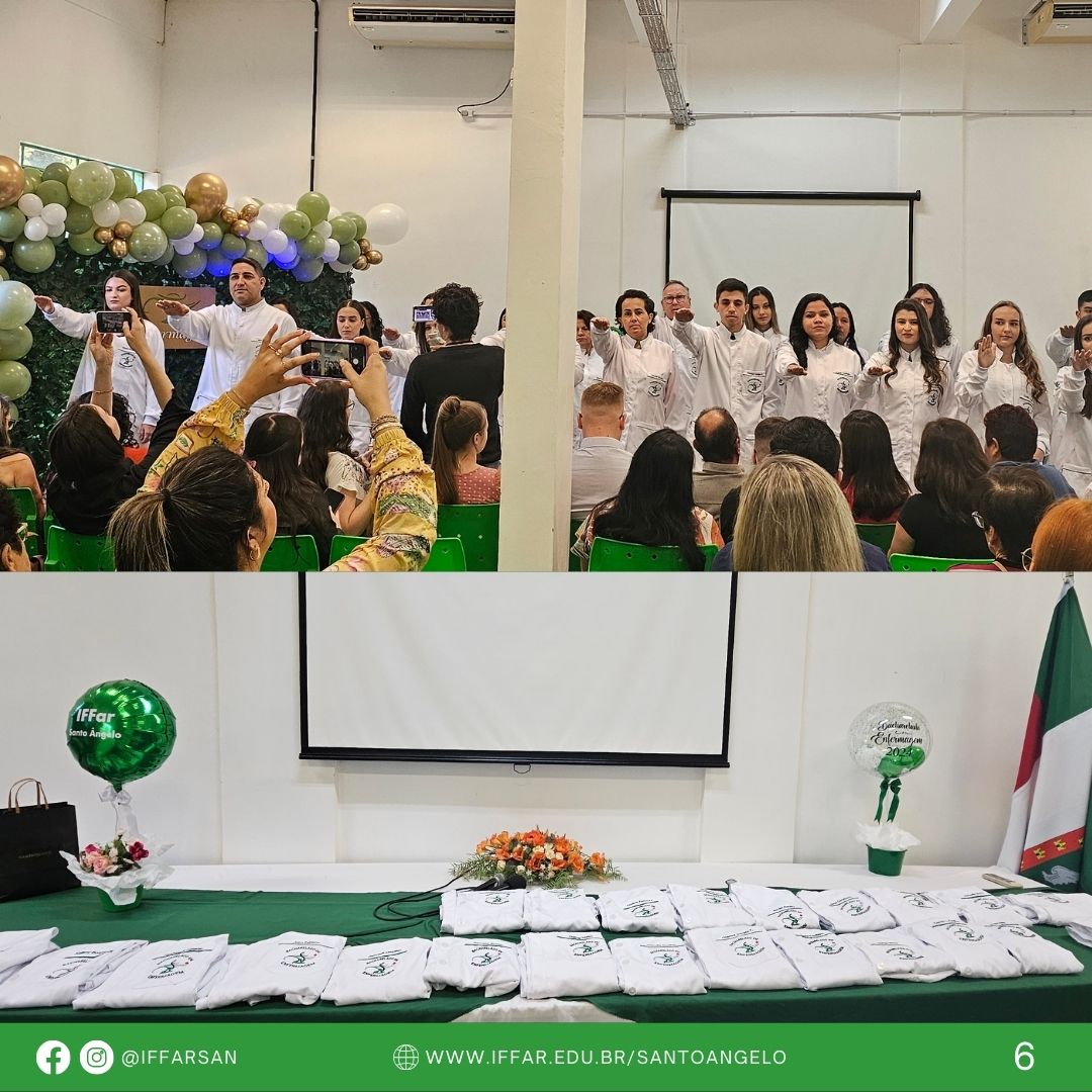 No dia 14/06/24 aconteceu a “Cerimonia de entrega do Jaleco”. Os jalecos, de todos alunos, estavam dispostos em cima da mesa cerimonial. Os mesmos foram entregues a um padrinho, escolhido pelo aluno, pela coordenação do curso, profª Sandra Cardoso. Feito isso, o padrinho fazia a entrega e ajudava o acadêmico a colocar o mesmo. Quando todos estavam em pose do jaleco, foi realizado juramento para usar o jaleco da enfermagem. Após a cerimônia aconteceu uma confraternização entre os alunos e seus familiares. Confira a transmissão gravada da cerimônia no canal do YouTube da WebTV IFFar-SAN: https://www.youtube.com/watch?v=yA-_5JTrs_Y