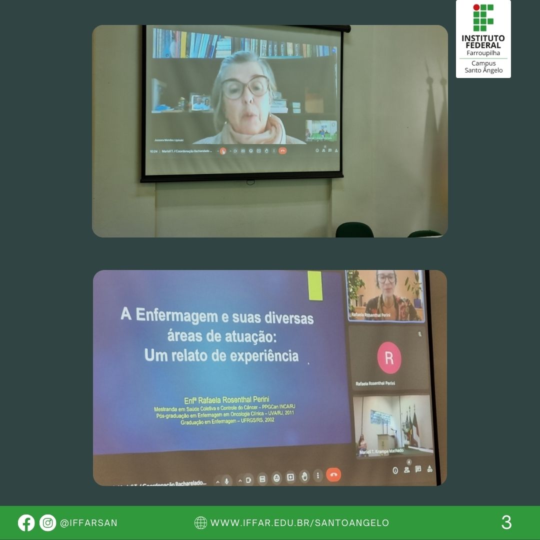 No dia 11/06/24 contamos com a mestranda em Saúde Coletiva e Controle do Câncer, Enfª Rafaela Perini, do RJ, com a fala “A enfermagem e suas diversas áreas de atuação: um relato de experiência” e após a Enfª Pós doc Jussara Lipinki contribui com “Dividir experiências na enfermagem e saúde para construção de um mundo mais humano”.