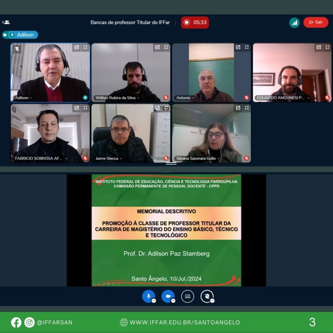 A Banca Especial de Avaliação foi constituída, de forma online por videoconferência, pelos seguintes Professores Doutores: Antônio Carlos Minussi Righes - Presidente (IFFar-São Vicente do Sul); Jaime Peixoto Stecca (UFSM); Silvana Saionara Gollo (IFRS-Erechim); Eduardo Angonesi Predebon (IFRS-Erechim) e Fabrício Sobrosa Affeldt (IFRS-Porto Alegre). O ato também contou com a presença do Prof. Dr. William Rubira da Silva, interlocutor, representante da Comissão Permanente de Pessoal Docente (CPPD) do IFFar - Campus Santo Ângelo, comissão esta responsável pela organização e acompanhamento de todo o processo do candidato a Professor Titular do EBTT. Ao final da apresentação, a banca fez suas considerações, se reuniu e aprovou, por unanimidade, o memorial apresentado pelo professor.