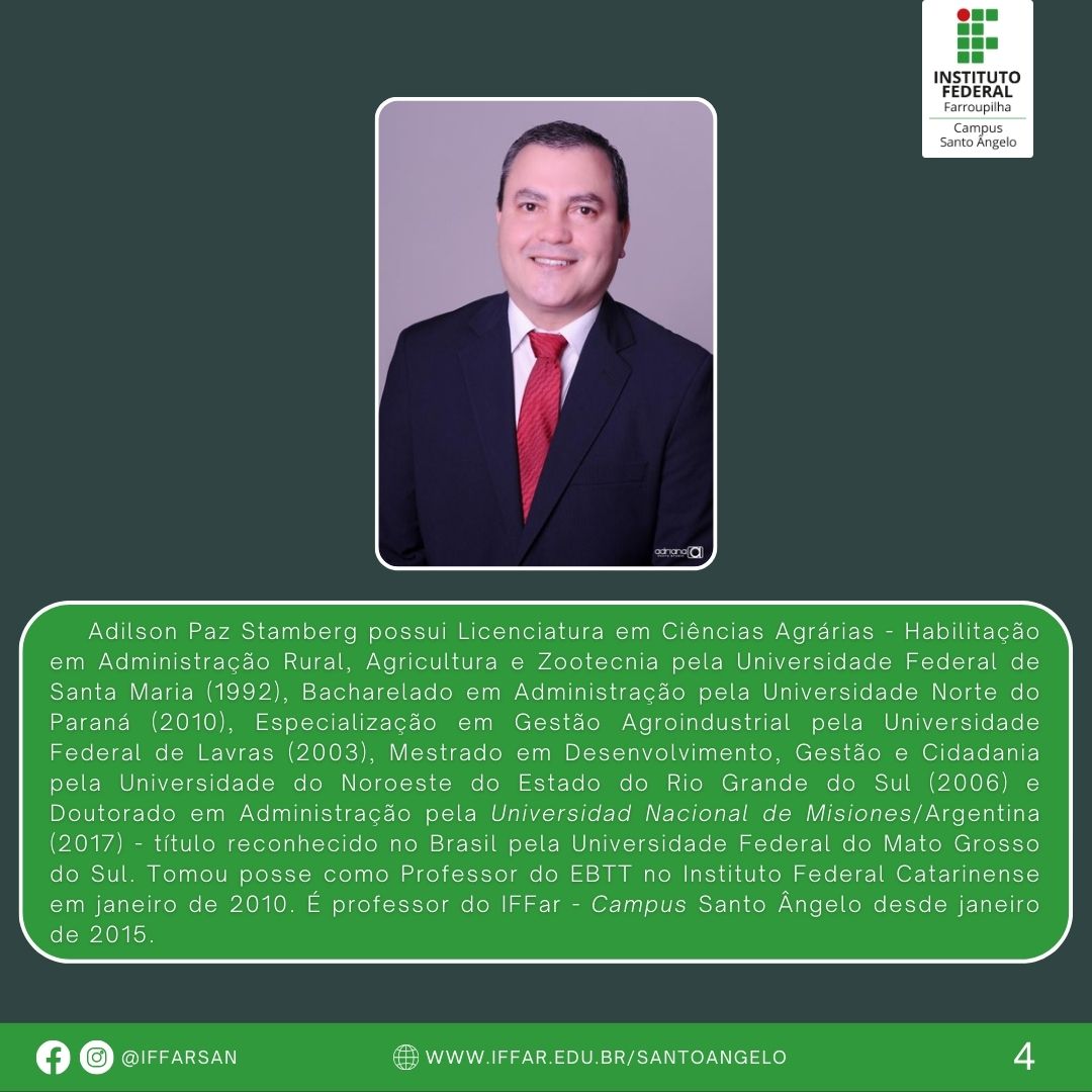 A Comunidade Acadêmica do IFFar - Campus Santo Ângelo parabeniza o Prof. Dr. Adilson Stamberg por esta merecedora conquista e deseja sucesso na continuidade de sua jornada de trabalho docente.
