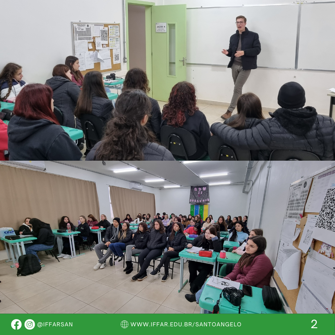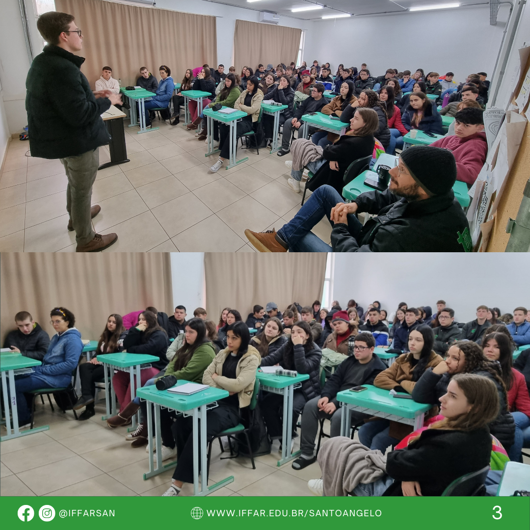 Nas manhãs dos dias 09 e 11 de julho de 2024, José Frederico compartilhou a sua trajetória exitosa, com estudantes dos Cursos Técnicos Integrados em Administração, Agricultura, Informática e servidores no IFFar-SAN. O egresso valorizou a importância de ter sido aluno do IFFar para seu sucesso no processo seletivo do exterior e falou da importância em aproveitar todas as oportunidades que a instituição proporciona, além do ensino qualificado, também a participação em projetos de ensino, pesquisa e extensão, como diferencial no seu currículo.
