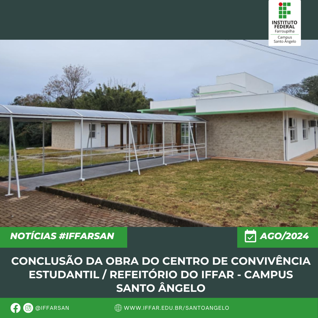 Na primeira quinzena do mês de julho de 2024, foi concluída e entregue à comunidade acadêmica do IFFar - Campus Santo Ângelo a obra do Prédio do Refeitório e Centro deConvivência Estudantil.