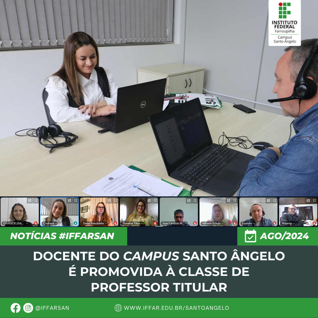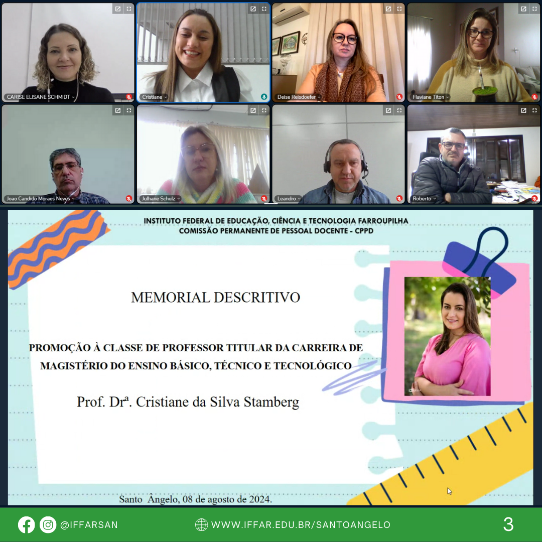 No dia 08 de agosto, a professora do IFFar - Campus Santo Ângelo, Dra. Cristiane da Silva Stamberg, defendeu Memorial Circunstanciado para Promoção à Classe de Professor Titular, última classe da Carreira de Magistério do Ensino Básico, Técnico e Tecnológico (EBTT).