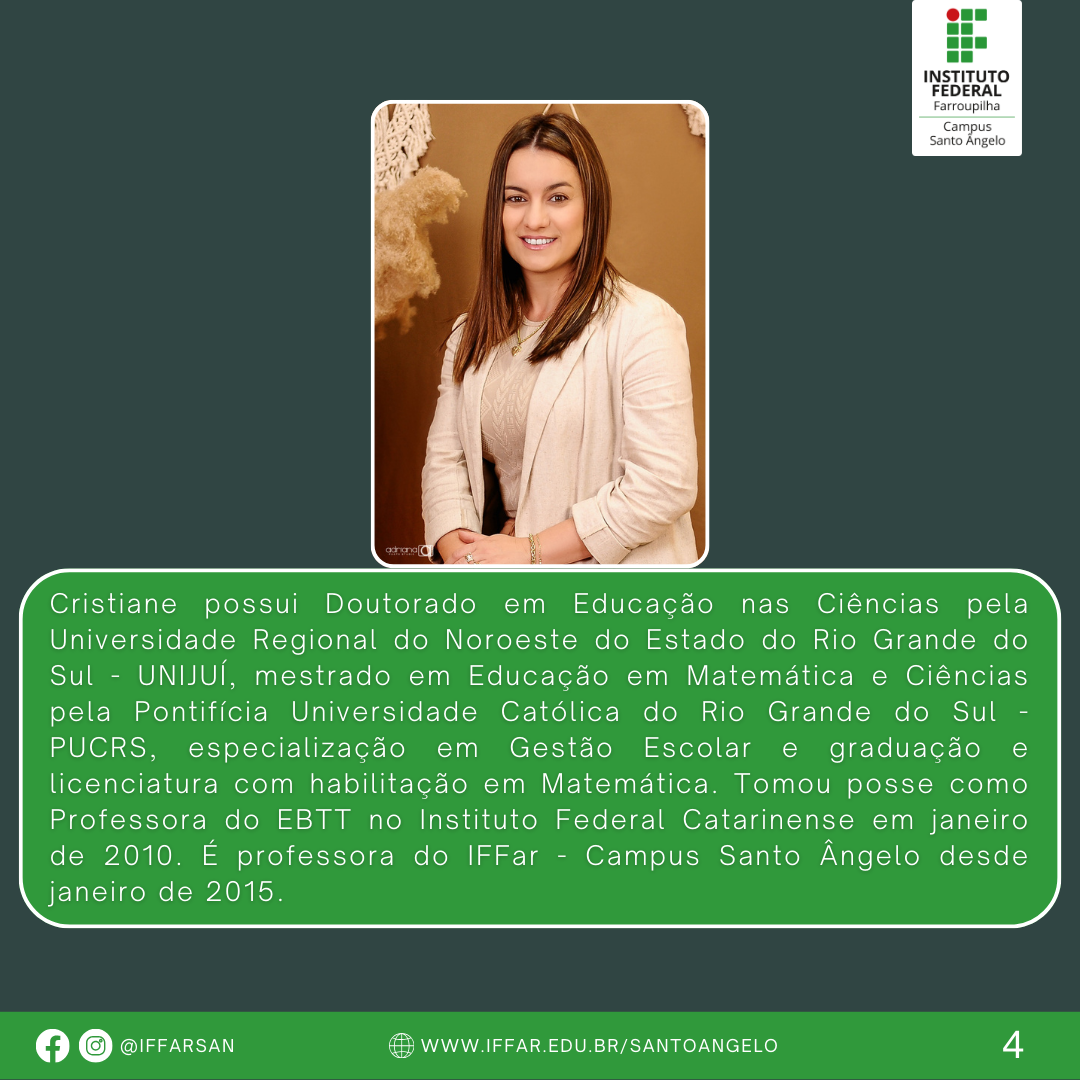Cristiane possui Doutorado em Educação nas Ciências pela Universidade Regional do Noroeste do Estado do Rio Grande do Sul - UNIJUÍ, mestrado em Educação em Matemática e Ciências pela Pontifícia Universidade Católica do Rio Grande do Sul - PUCRS, especialização em Gestão Escolar e graduação e licenciatura com habilitação em Matemática. Tomou posse como Professora do EBTT no Instituto Federal Catarinense em janeiro de 2010. É professora do IFFar - Campus Santo Ângelo desde janeiro de 2015.