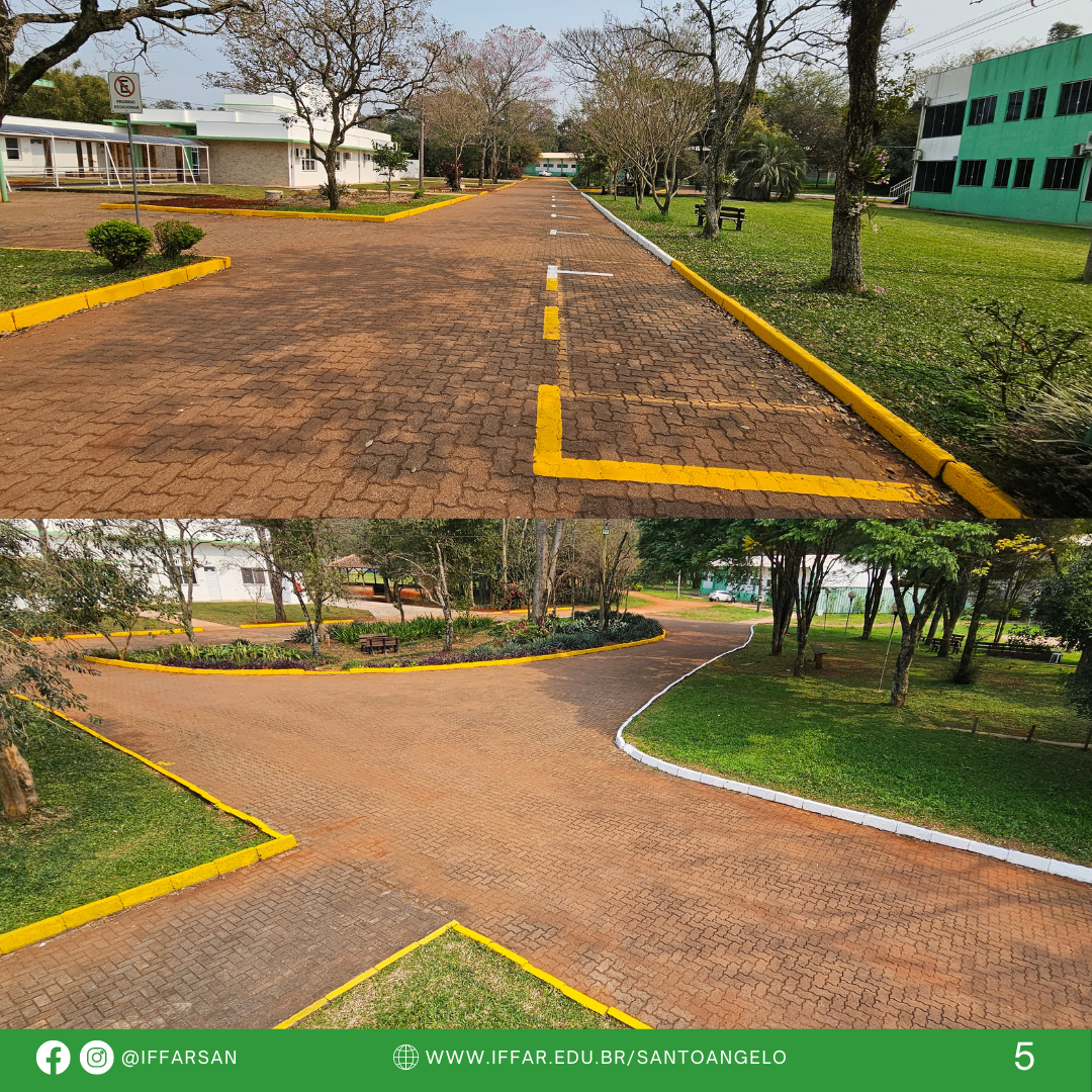 Para realização do serviço de pinturas, contou-se com o apoio e colaboração da equipe do Departamento Municipal de Trânsito (DMT). Gratidão pela contribuição na execução dessa ação, de fundamental importância para melhorias no Campus Santo Ângelo.