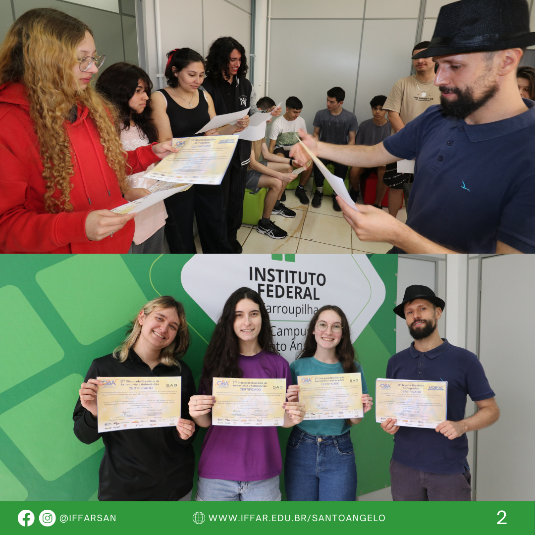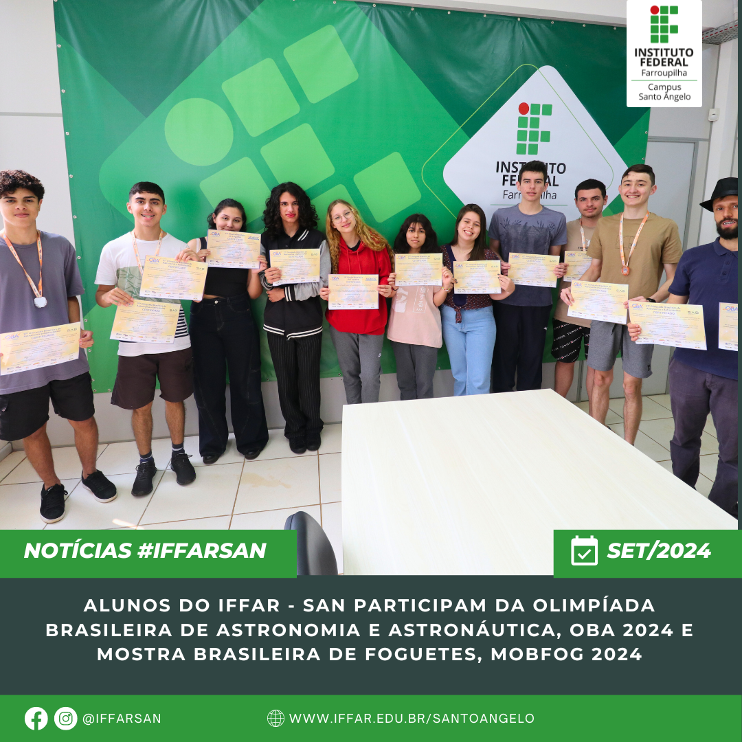Sob a organização do professor Willian Rubira da Silva, pela primeira vez o IFFar Campus Santo Ângelo participou da Olimpíada Brasileira de Astronomia e Astronáutica, OBA 2024 e Mostra Brasileira de Foguetes, MOBFOG 2024 que a Universidade Estadual do Rio de Janeiro organiza todo ano.