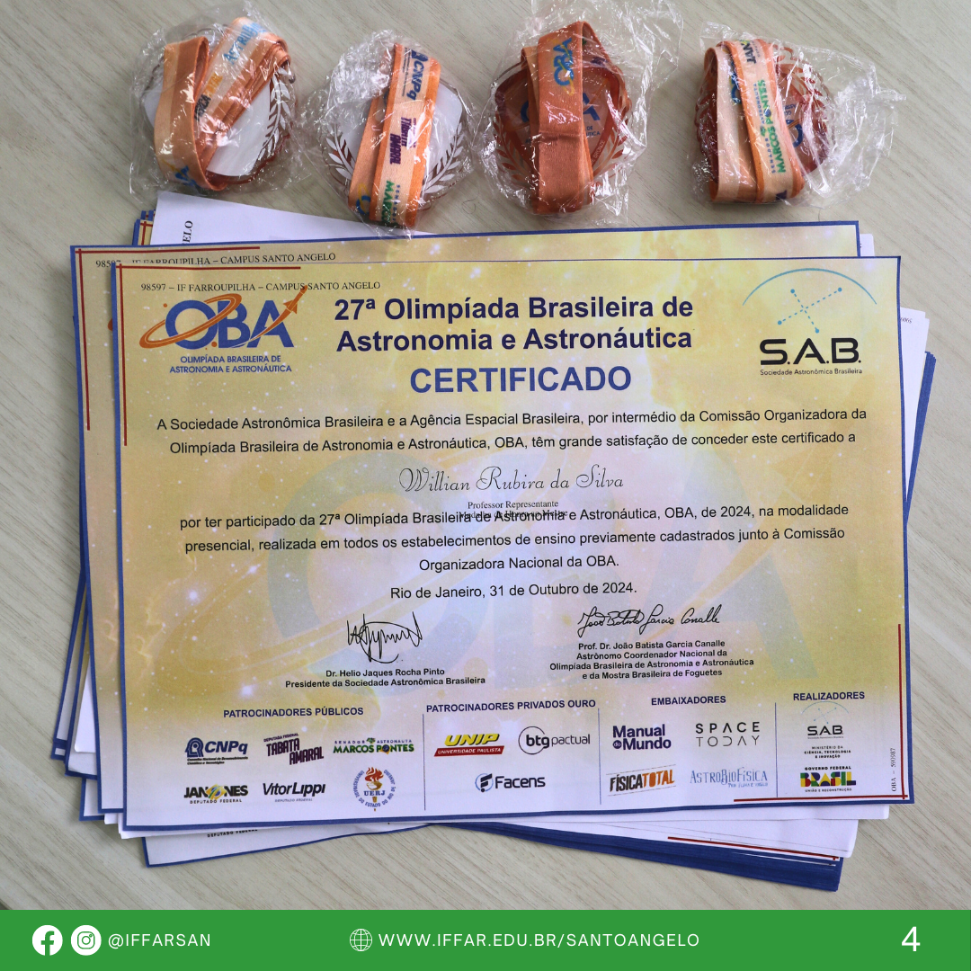 O certificado de participação do IFFar ficará disponível no Projeto de Astronomia coordenado pela Professora Karlise Soares Nascimento e no laboratório de Física no Projeto de Foguetes coordenado pelo Professor Willian Rubira da Silva.
