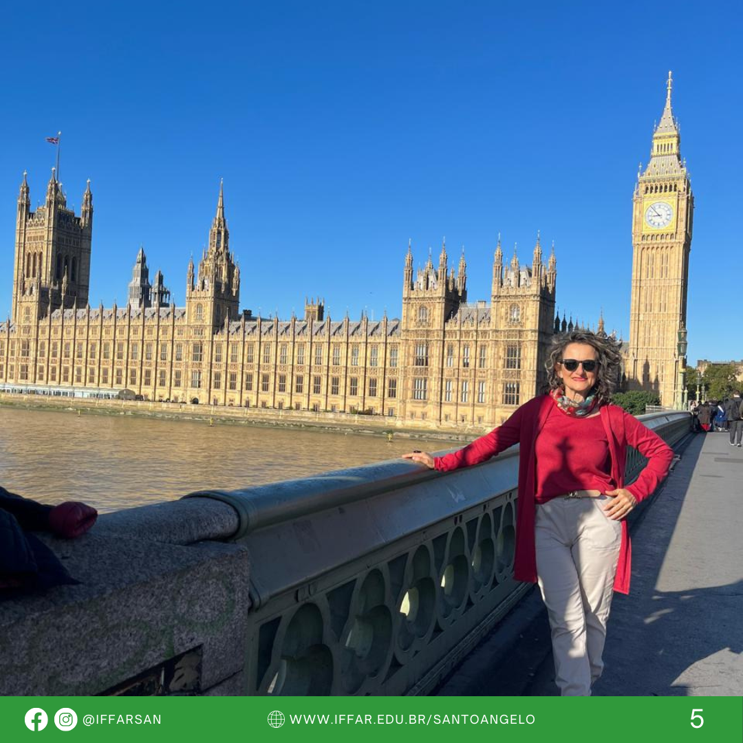 Também foram vivenciadas experiências relacionadas com a língua italiana, além da apreciação da arte italiana nos museus. O espetáculo de ópera, no Royal House, La Traviata, foi muito impactante. Esta vivência será explorada nas lições de italiano que a professora leciona por meio do NAI, com uma turma no campus e outra no centro da nossa cidade. Também, no Globe Theatre, assistiu ao espetáculo Anthony e Cleópatra, obra de Shakespeare, encenada no palco que é réplica do teatro que serviu de arena para as peças do famoso escritor britânico. Ao visitar este espaço, antes do espetáculo, a docente organizou uma reunião pelo Google meet, com a Turma AGR11, mostrando as margens do Tâmisa, o Teatro de Shakespeare, as pessoas transitando e uma turma de alunos uniformizados que se dirigiam, também, ao teatro. Foi um momento muito interessante em que, mediados pelas tecnologias, interagiram, professora e alunos, em tempo real, compartilhando a emoção de estar em um lugar tão importante, onde viveu e atuou Shakespeare. Vários alunos desta turma leram o autor britânico no I semestre.