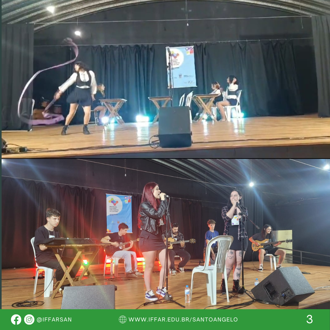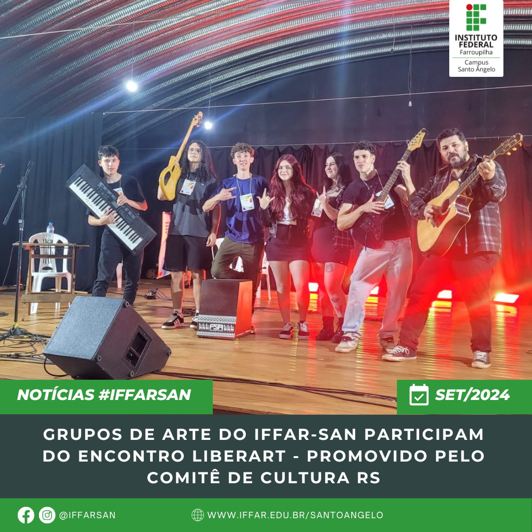 Os grupos de Dança, de Teatro e de Música, do IFFAR-SAN, ligados aos projetos de Ensino Artes Integradas e de Extensão Ondas - ano 5, participaram do Encontro Liberart, evento regional no Parque de Exposições Vanderlei Burmann, em Ijuí, no dia 28/09/2024. O IFFar-SAN participou apresentando uma peça de teatro denominada "Educação de Qualidade?", uma dança com coreografia no estilo pop e encerrou o evento com a Banda INFFAMES, que contou com a participação do músico Jair Gonçalves como convidado.