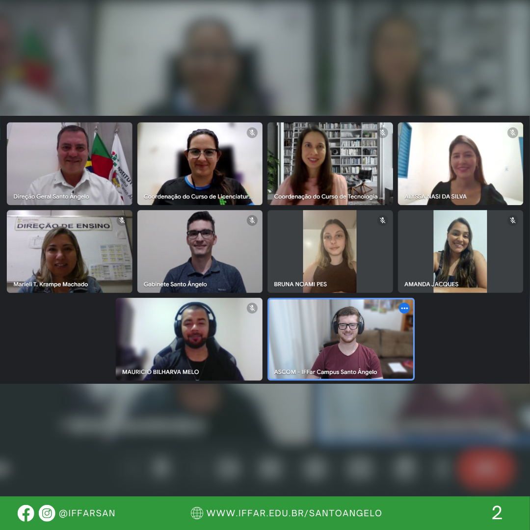 O evento aconteceu de forma remota, pela plataforma Google Meet, com transmissão pela WebTV IFFar-SAN, contando com a participação do Diretor Geral, Prof. Adilson Stamberg, Diretora de Ensino, Prof. Marieli Krampe Machado, Professoras Coordenadores dos Cursos Superiores, Zípora Quinteiro (CSTEC) e Karlise Soares Nascimento (CSLC), além dos servidores da Assessoria de Comunicação, Samuel Foratti e Chefia de Gabinete, Evandro Both.