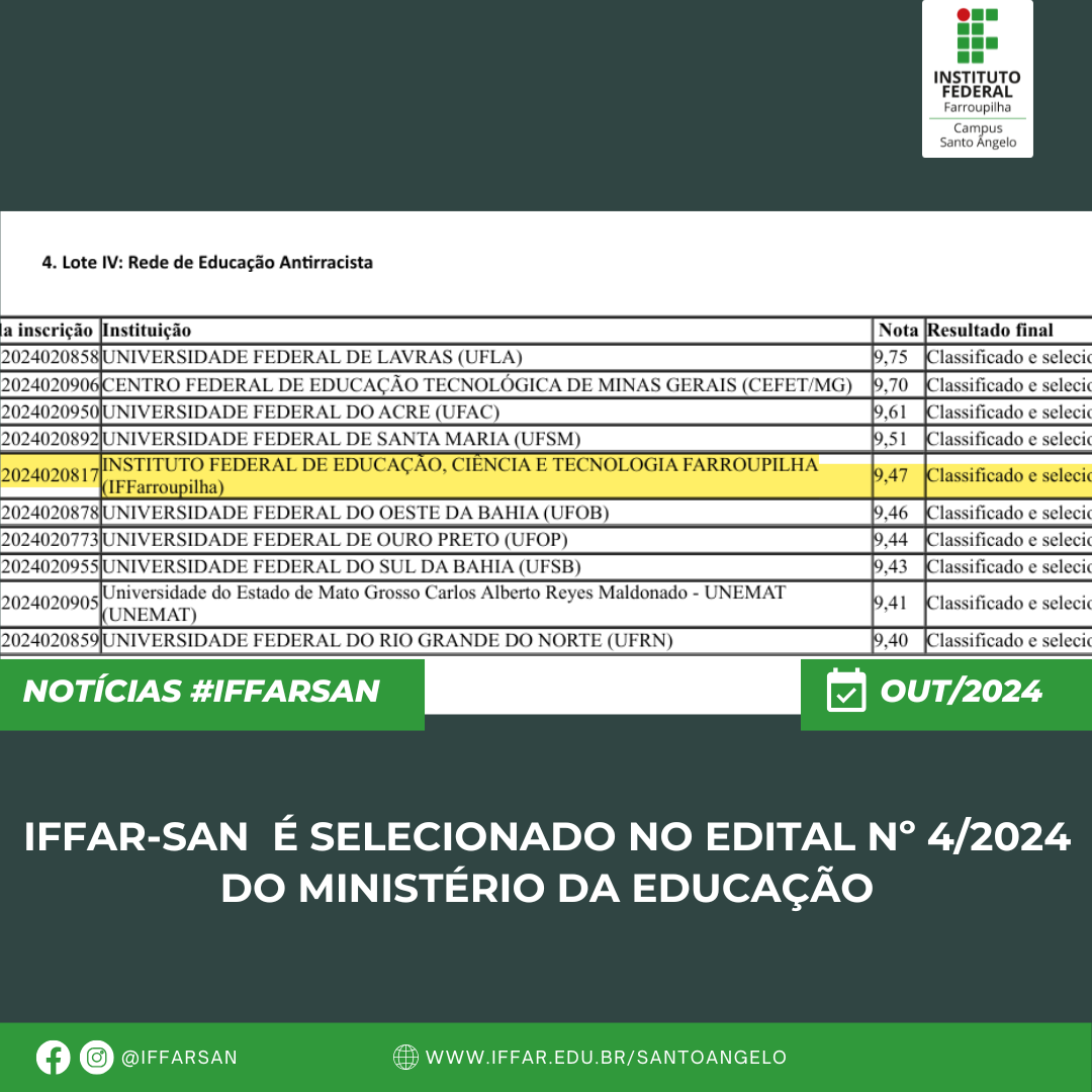 O Instituto Federal Farroupilha Campus Santo Ângelo é selecionado no Edital Nº 4/2024 do Ministério da Educação