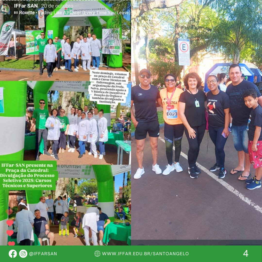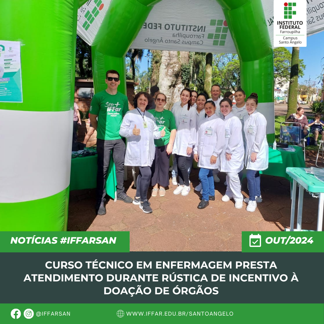 No dia 20 de outubro, o Curso Técnico em Enfermagem do IFFar-SAN participou da V Rústica de Incentivo a Doação de Órgãos, prestando atendimento de verificação de Pressão Arterial aos participantes e visitantes do evento e de primeiros socorros a atletas que apresentaram algum quadro de disfunção durante ou após a corrida.