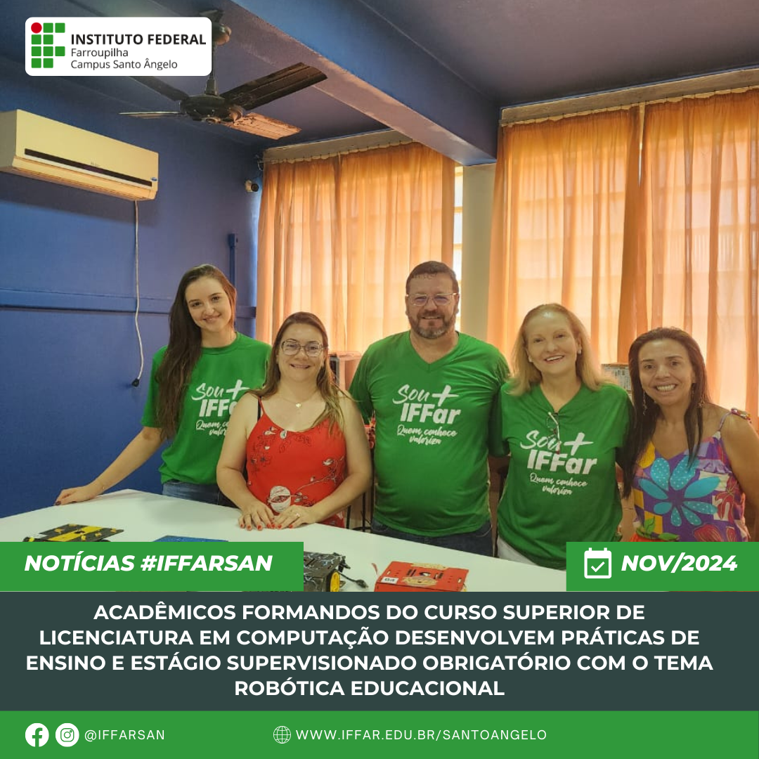 Os acadêmicos Camilla Luiza Fanzlau e Leandro Ventura Farias, estudantes do Curso Superior de Licenciatura em Computação, desenvolveram importantes atividades de ensino, no campo da Robótica Educacional, envolvendo estudantes da Educação Básica, na Escola Técnica Estadual em Entre-Ijuís. Foi um trabalho muito elogiado pela equipe gestora da instituição, especialmente pela Supervisora Pedagógica Suzana da Costa.