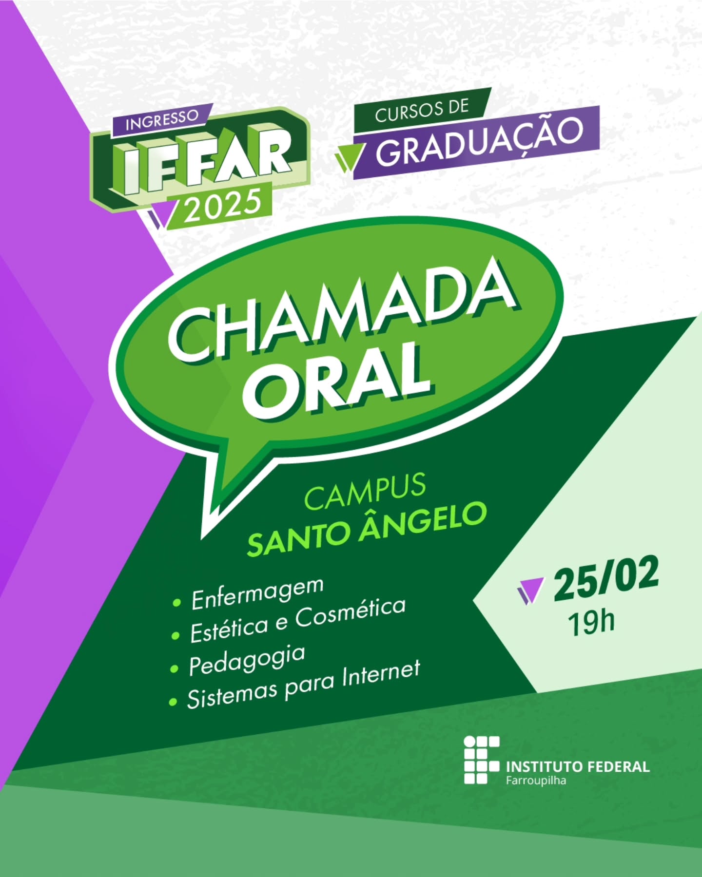 Na próxima terça-feira, dia 25/02, o Campus Santo Ângelo realizará a Chamada Oral de candidatos suplentes para o preenchimento de vagas remanescentes dos seguintes Cursos de Graduação: