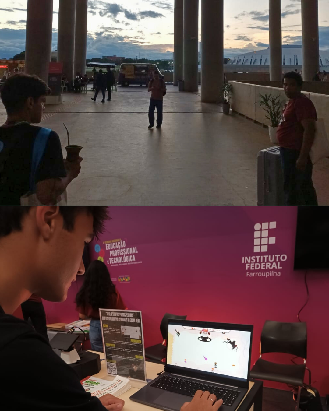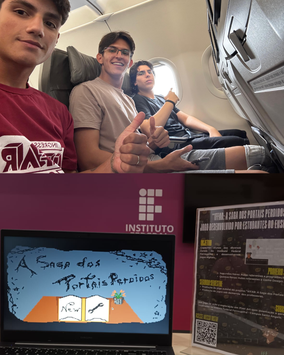 O aluno Luis Eduardo Baumgartner De Quadra, do Curso Técnico em Informática, 3º ano, está apresentando o jogo "IFFAR: A Saga dos Portais Perdidos", desenvolvido no projeto de Ensino "Produção de Jogos Eletrônicos", coordenado pelos professores Willian Rubira e Willian Dutra.