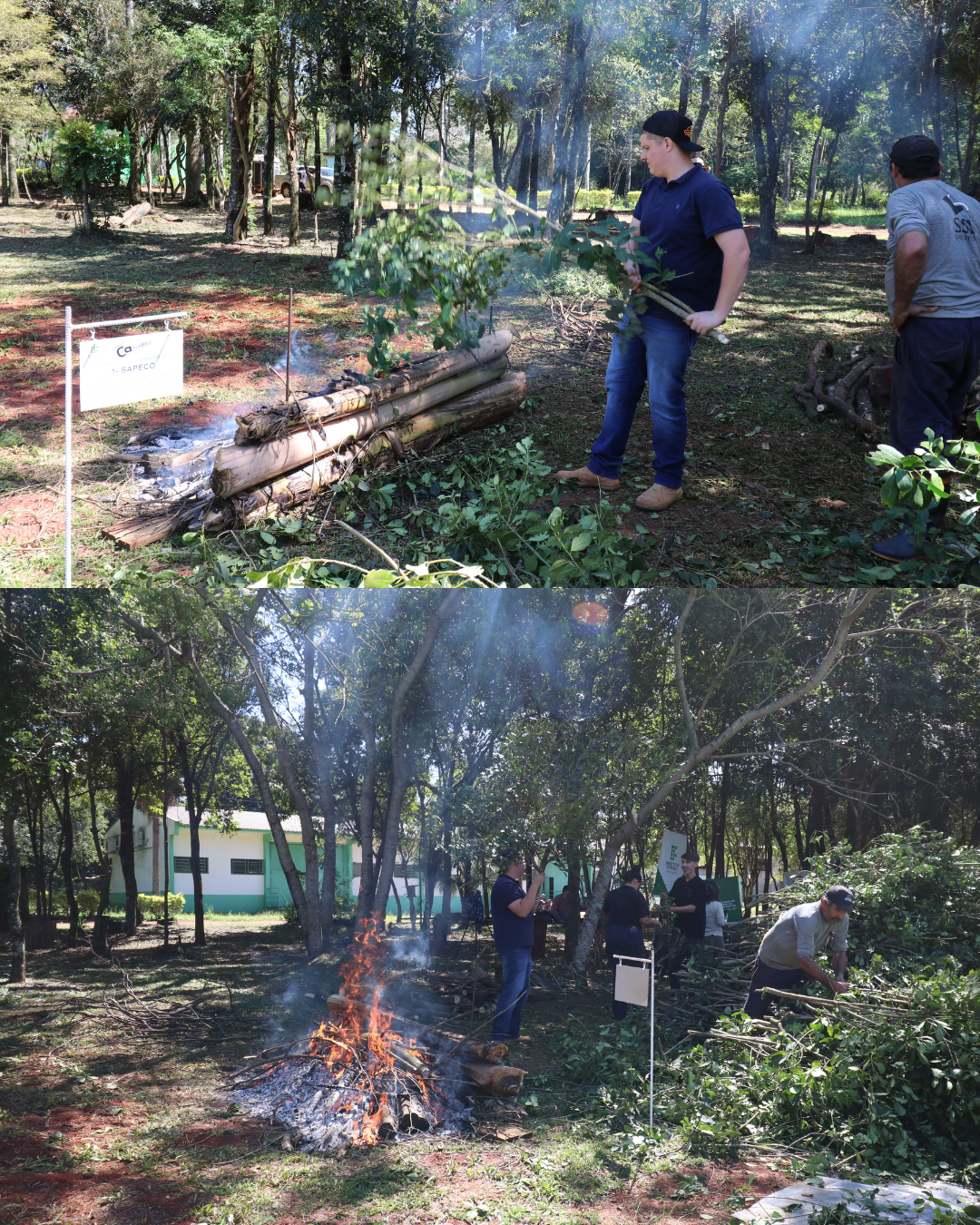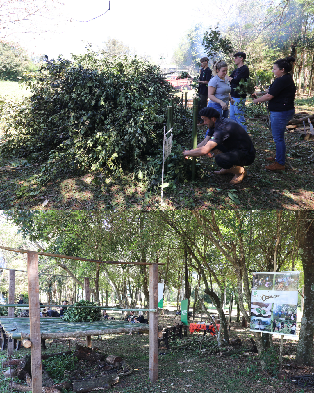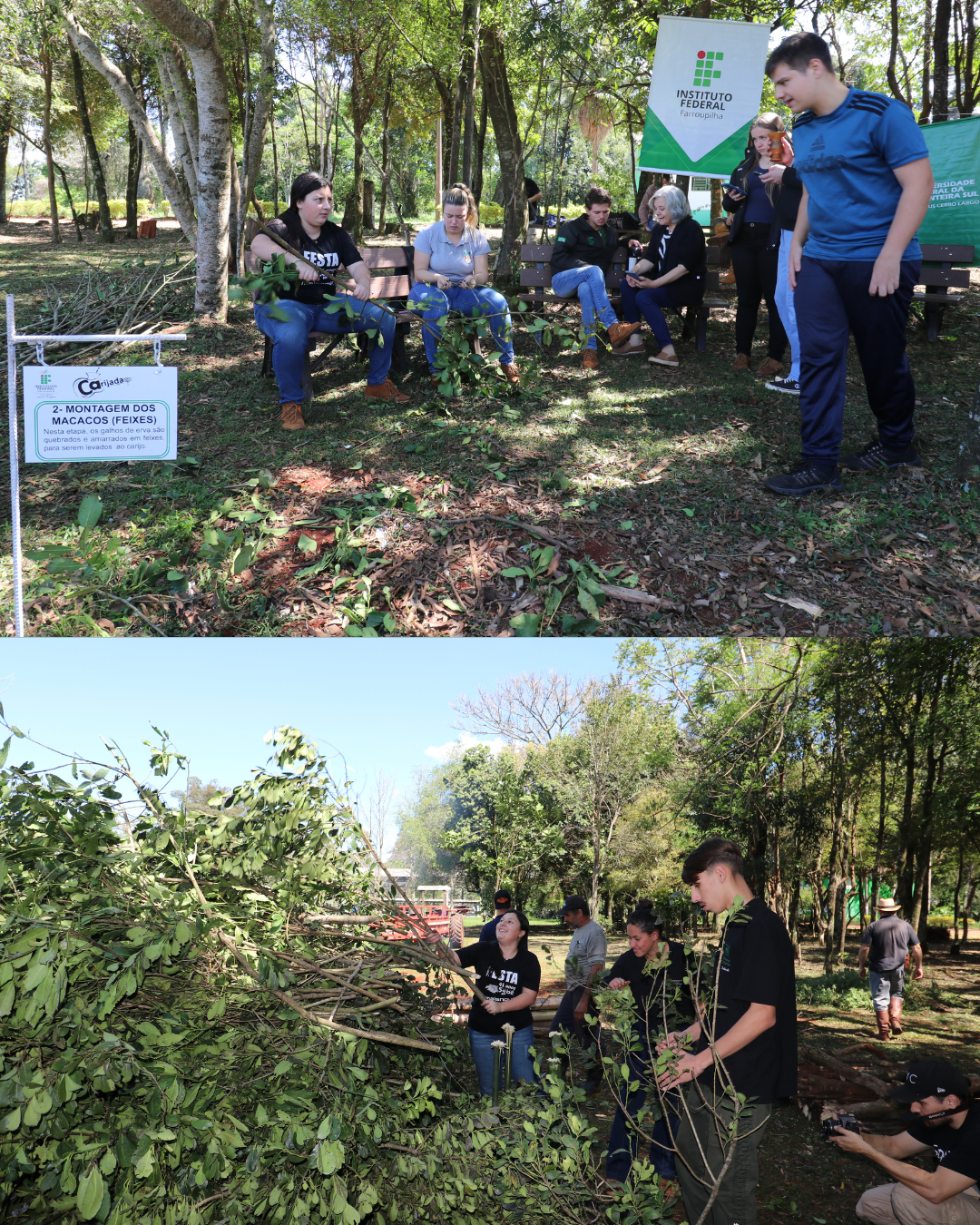 O processo de produção de erva-mate se estendeu ao longo dos dois dias, envolvendo alunos do campus e visitantes, desde a colheita da planta, o sapeco, a formação dos macacos, a secagem no carijo, o cancheamento e, por fim, a pilagem da erva e o sorver do chimarrão com a erva-mate produzida. Esses momentos são vivenciados com muita alegria por parte dos alunos, em especial dos cursos técnicos integrados.