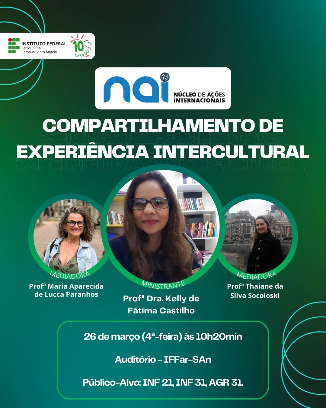 O Núcleo de Ações Internacionais (NAI) do IFFar - Campus Santo Ângelo convida você para um evento especial sobre Compartilhamento de Experiência Intercultural, com a Profª Dra. Kelly de Fátima Castilho.
