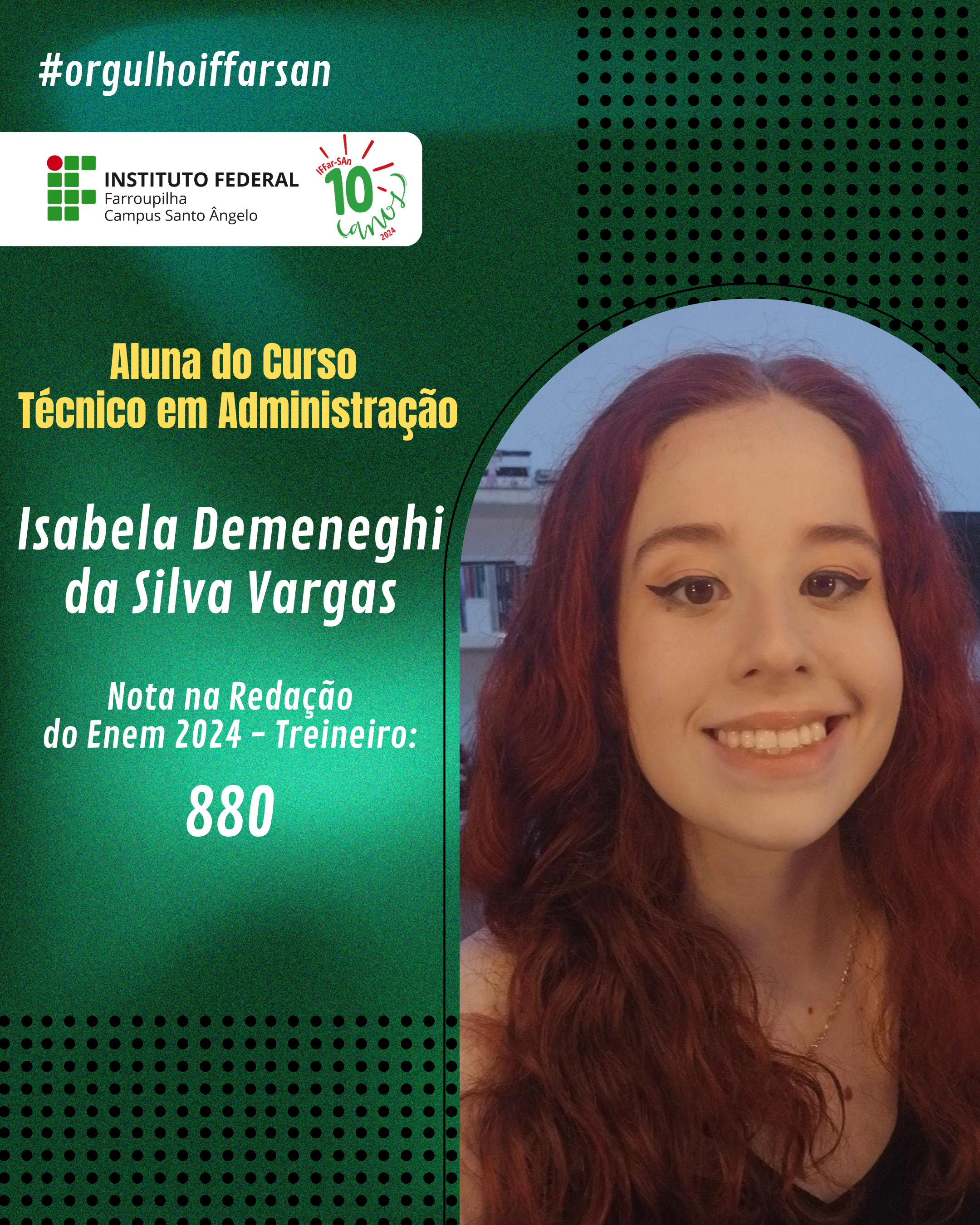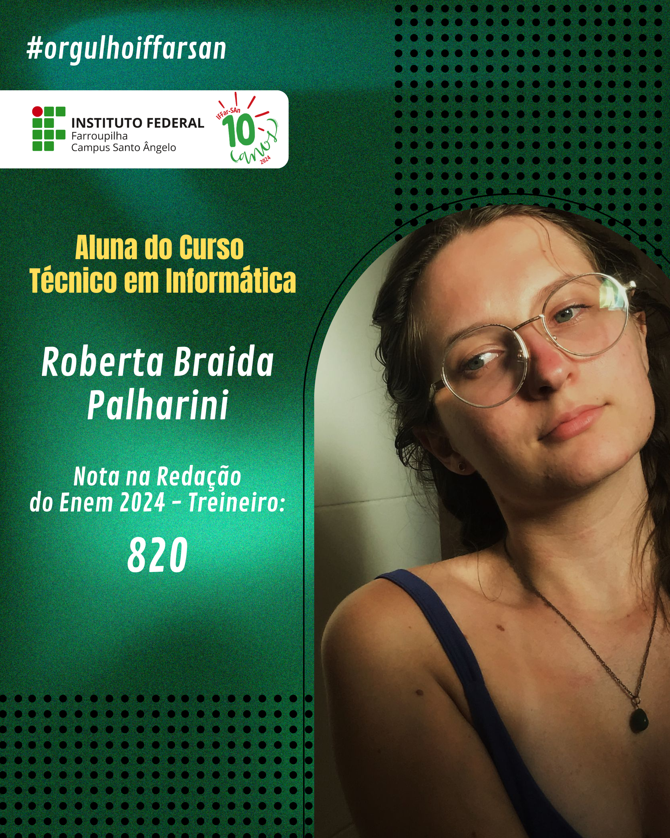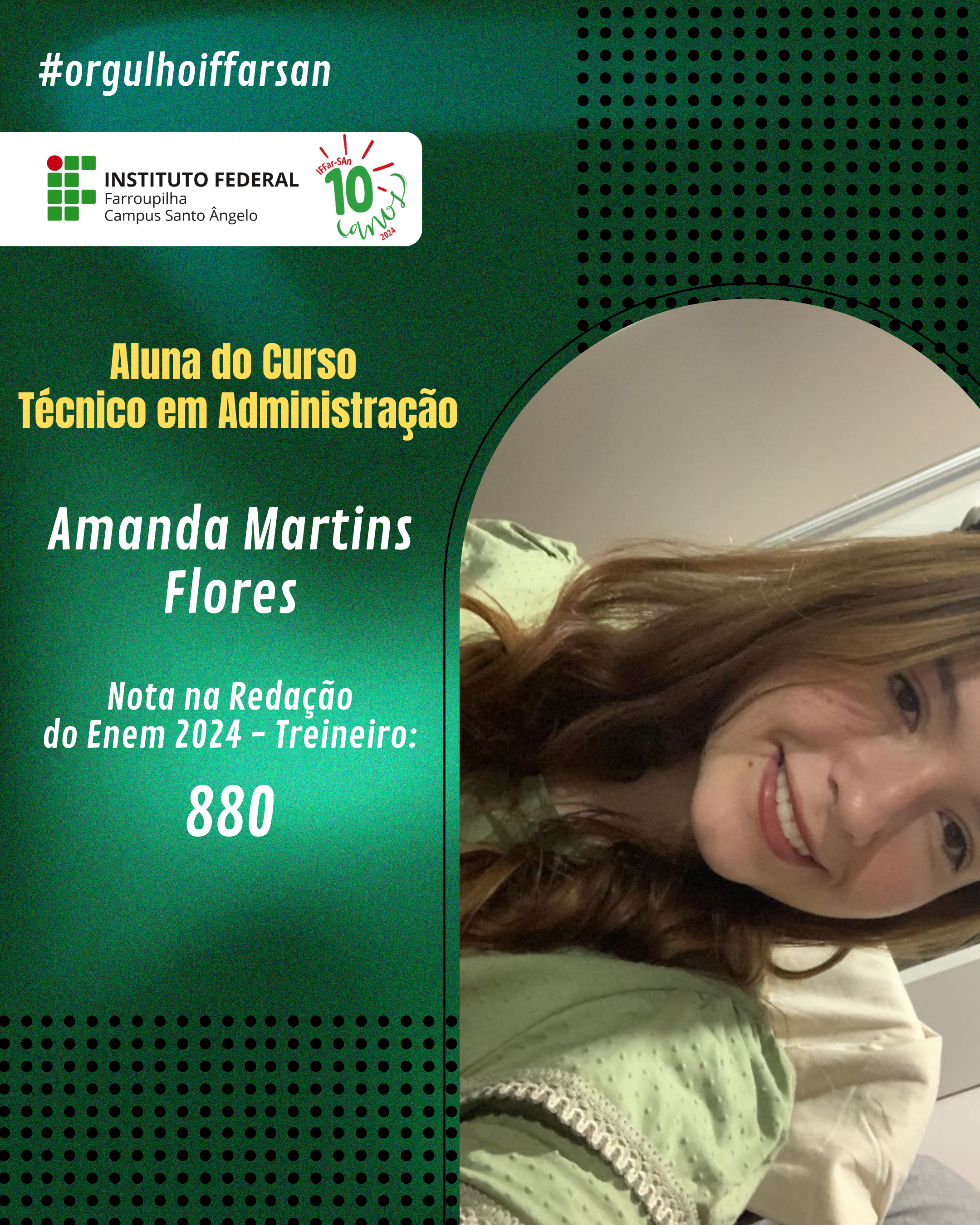 Esse resultado não é apenas uma vitória individual, mas também reflete o compromisso do IFFar-SAn em oferecer uma educação de qualidade, que prepara seus alunos para enfrentar grandes desafios. Estamos de portas abertas para apoiar nossos ingressantes, oferecer o suporte e incentivo necessários para que cada estudante cresça, se desenvolva e conquiste seus objetivos acadêmicos e profissionais. Juntos, faremos a diferença na vida de cada um!