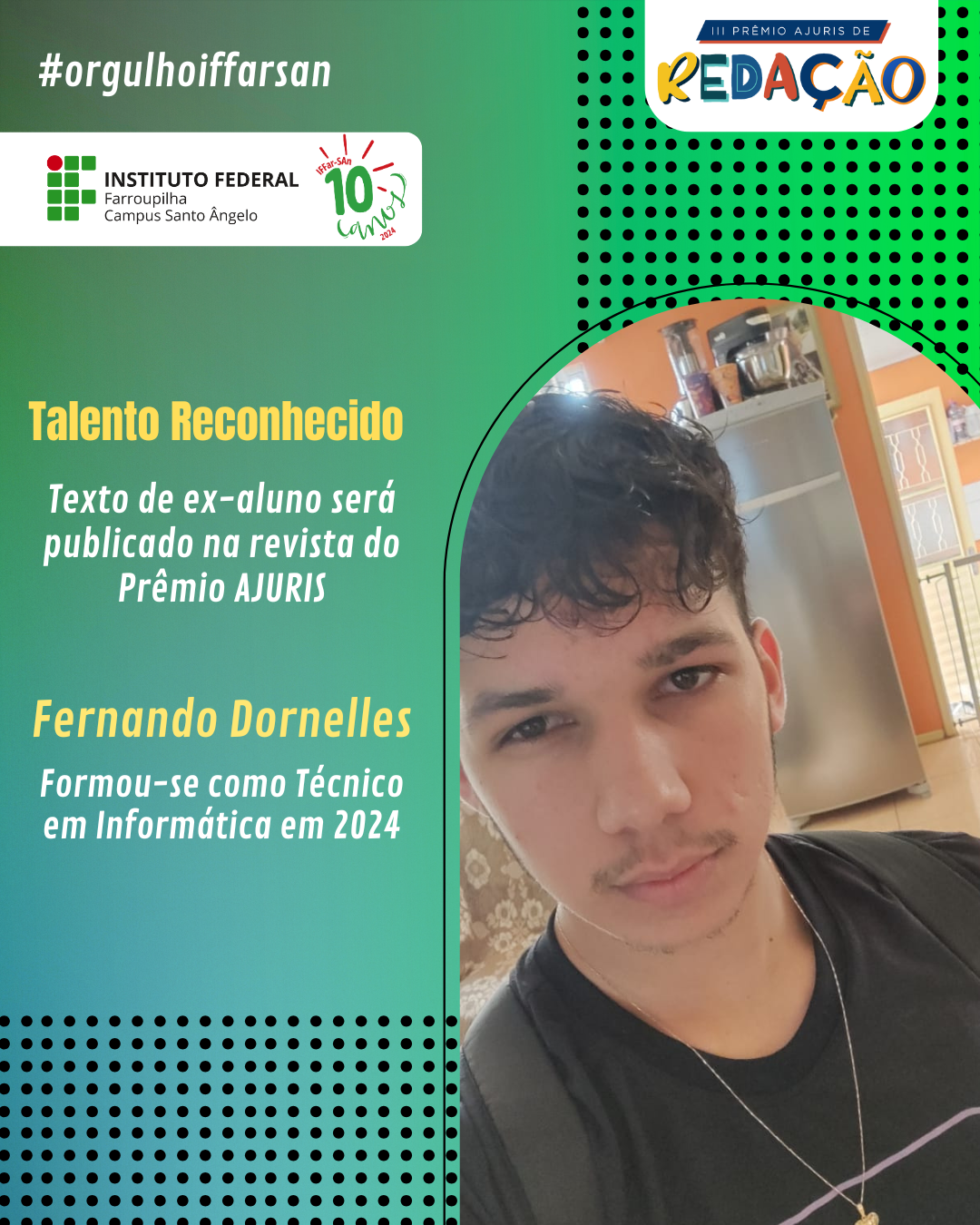 Com grande alegria, compartilhamos uma conquista especial de nosso ex-aluno Fernando Dornelles, que concluiu o Curso Técnico em Informática Integrado em 2024 no IFFar - Campus Santo Ângelo.