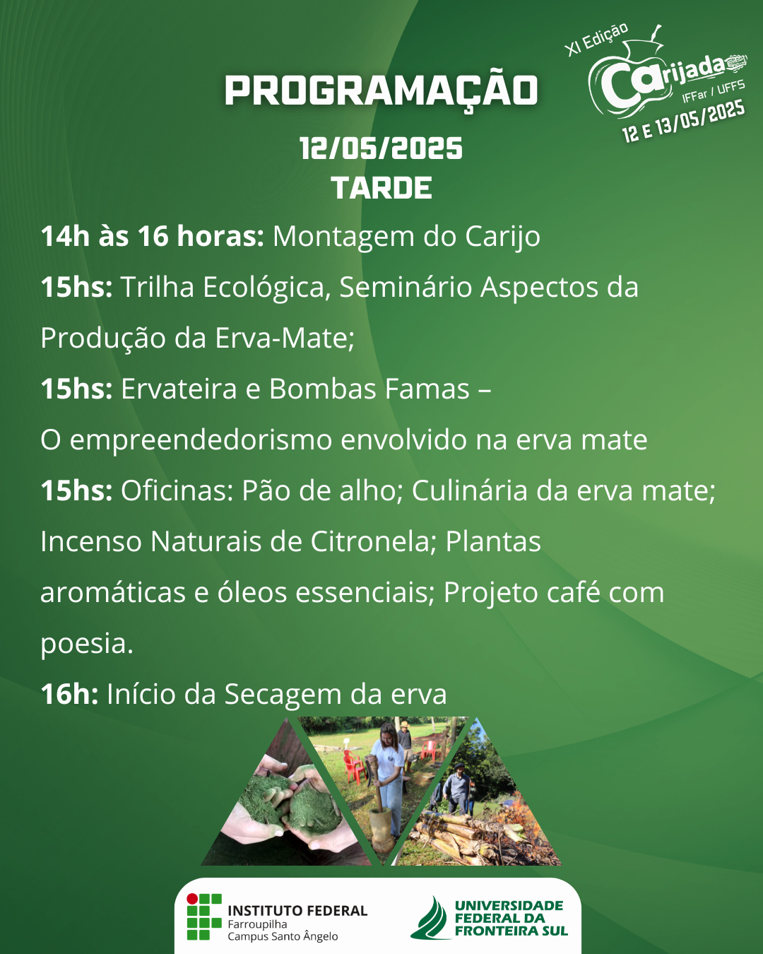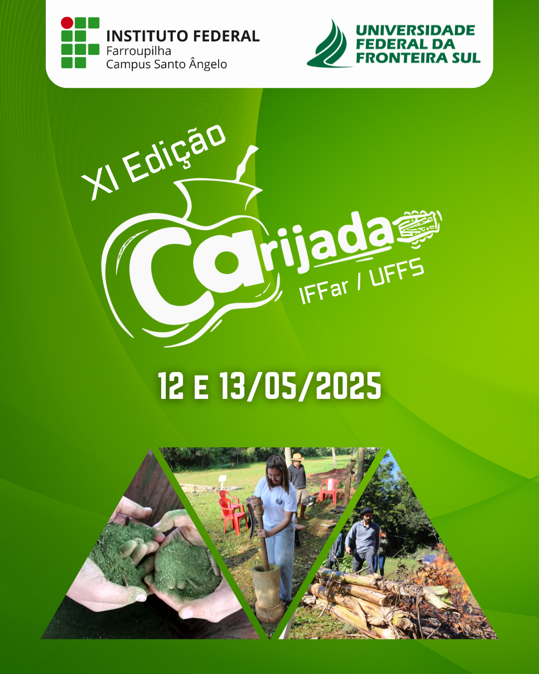Entre os dias 12 e 13 de maio de 2025 estará acontecendo, nas dependências do Instituto Federal Farroupilha Campus de Santo Ângelo, mais uma carijada. Através de uma ação de extensão, em parceria com a UFFS Campus de Cerro Largo, buscamos reviver a prática ancestral de produção artesanal de erva-mate pelo método de carijo.