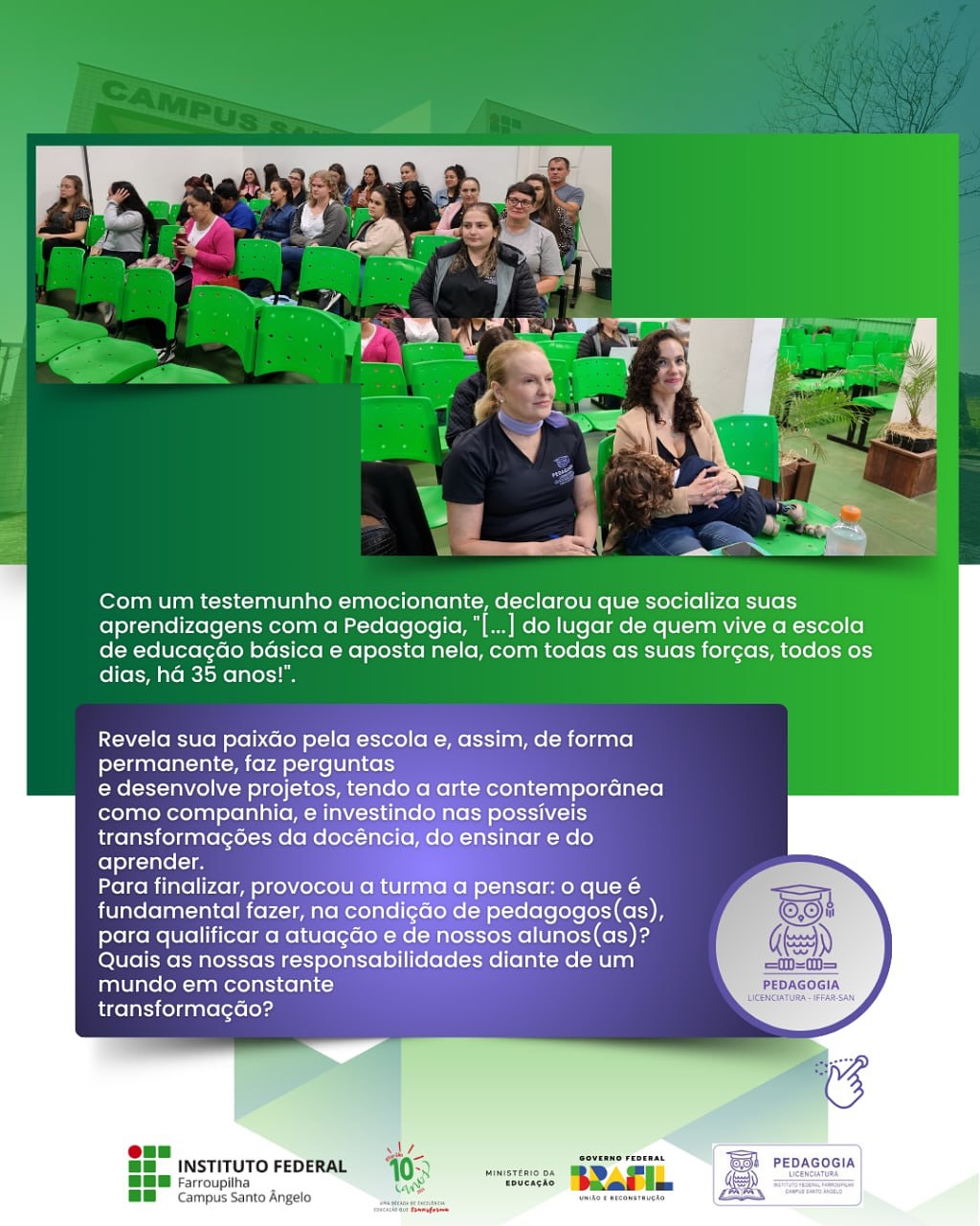 Com um testemunho emocionante, declarou que socializa suas aprendizagens com a Pedagogia, "[...] do lugar de quem vive a escola de educação básica e aposta nela, com todas as suas forças, todos os dias, há 35 anos!".