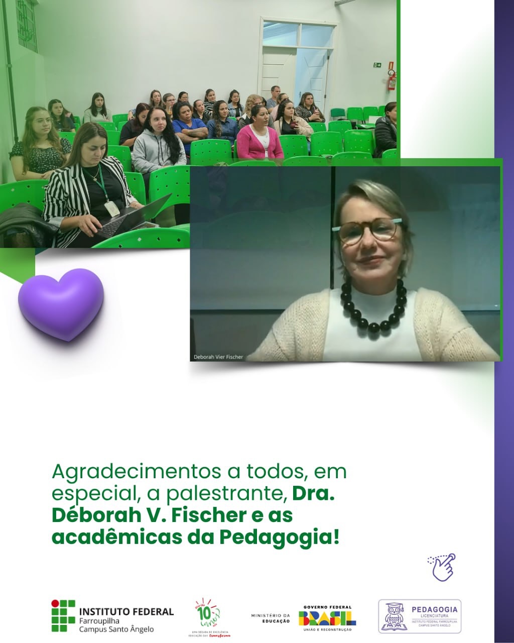 Agradecimentos a todos, em especial, a palestrante, Dra. Déborah V. Fischer e as acadêmicas da Pedagogia!