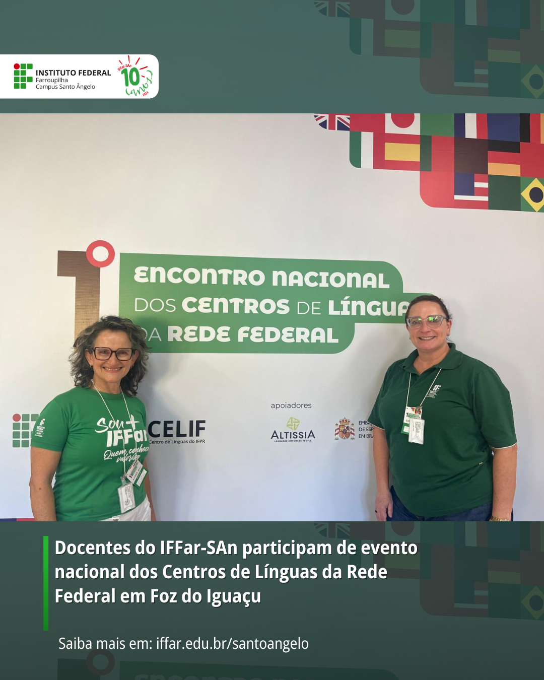 Entre 14 e 16 de maio de 2025, as docentes do IFFar SAN, Maria Aparecida Lucca Paranhos e Letícia Domanski participaram do I Encontro Nacional dos Centros de Línguas da Rede Federal. O evento reuniu representantes de todas as 41 instituições da Rede Federal de Educação Profissional, Científica e Tecnológica (EPCT). O evento aconteceu no auditório do Itaipu Parquetec e no IFPR - Campus Foz do Iguaçu.