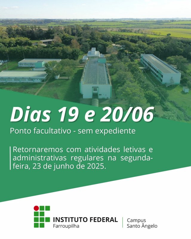 Nos dias 19 e 20 de junho não haverá atividades letivas nem administrativas no IFFar – Campus Santo Ângelo, em virtude do ponto facultativo, conforme a Portaria MGI nº 9.783/2024.