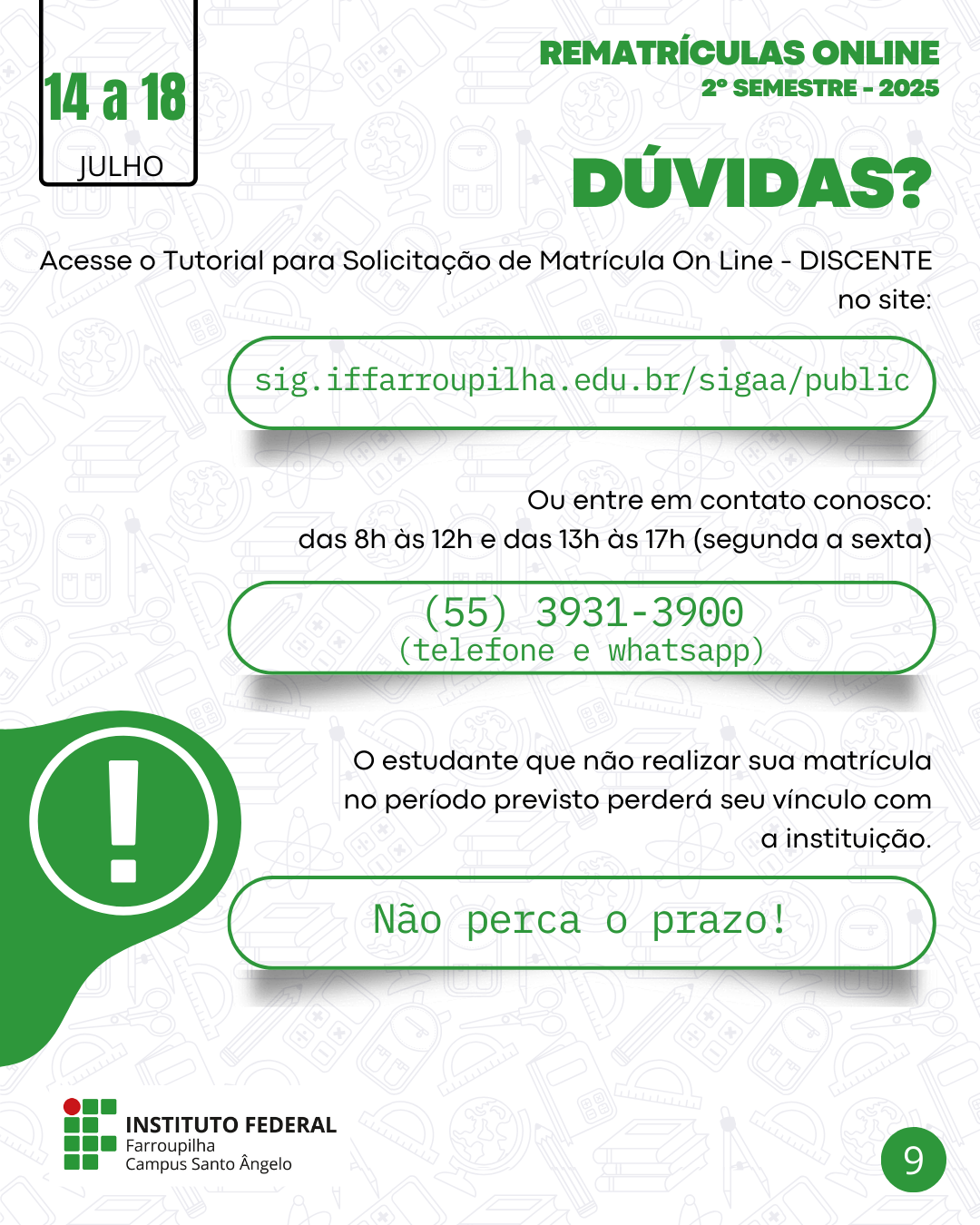 O período de rematrícula online para o 2º semestre de 2025 é de 14 a 18 de julho, por meio do SIGAA Acadêmico, disponível no Portal do Discente.