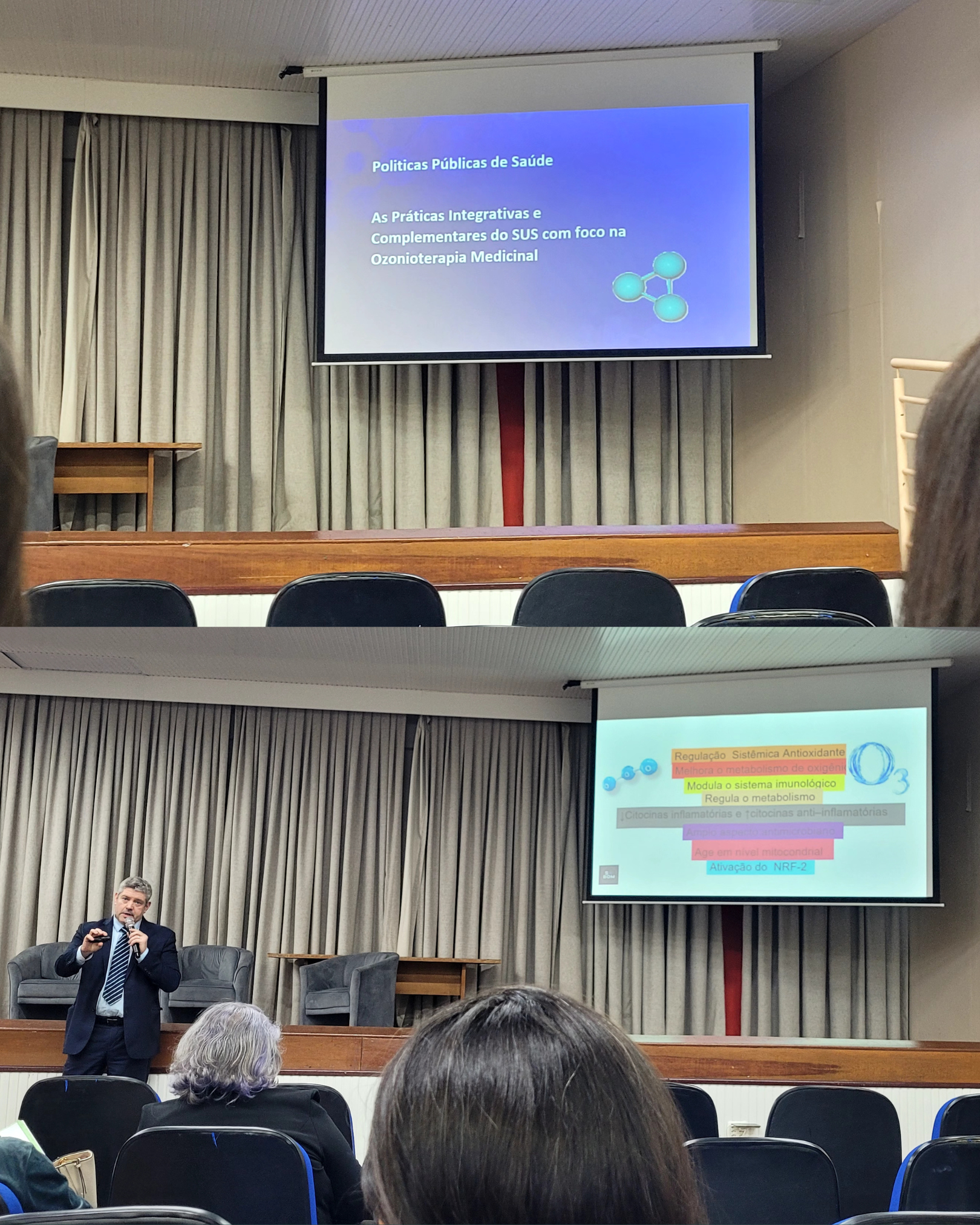 Cursos do Eixo de Ambiente e Saúde do IFFar-SAn participam de palestra "As Práticas Interativas e Complementares do SUS com foco na Ozonioterapia" na URI - Santo Ângelo