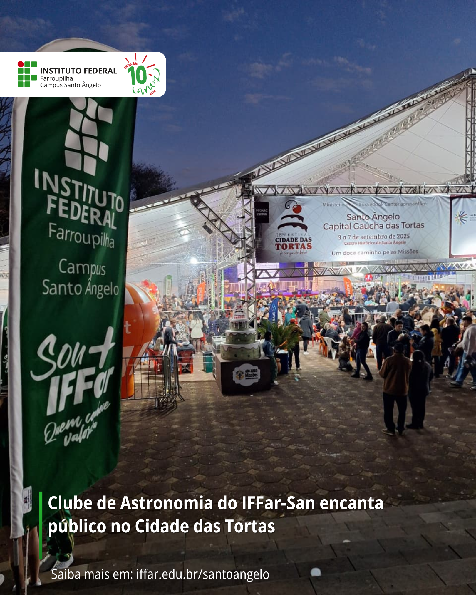 No último sábado, 6 de setembro de 2025, o Clube de Astronomia do Instituto Federal Farroupilha – Campus Santo Ângelo participou das atividades do evento Cidade das Tortas, proporcionando ao público uma experiência científica e cultural inesquecível.