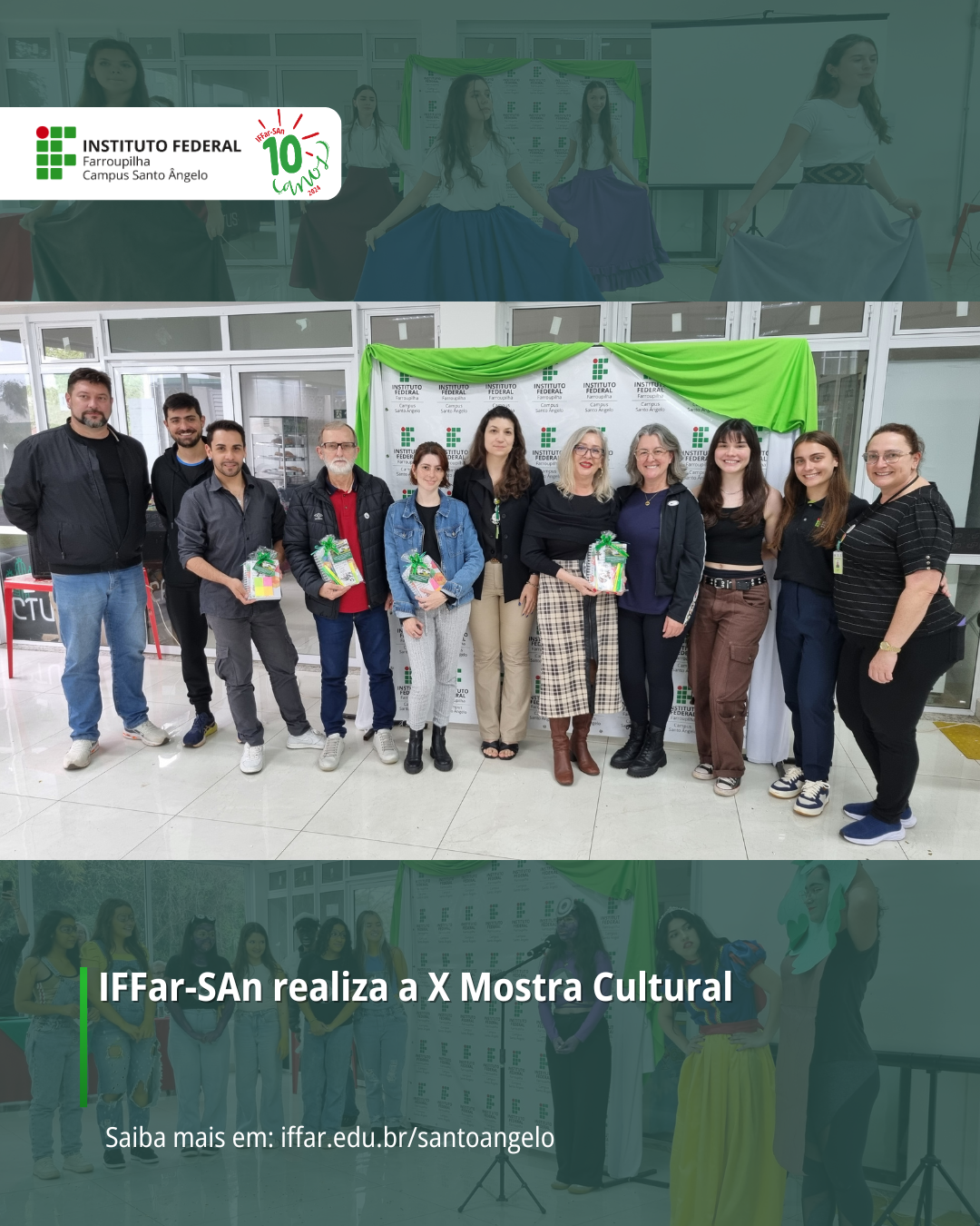 No último dia 15/09/2025 realizou-se no Centro de Convivência do IFFar Campus Santo Ângelo a X Mostra Cultural, momento em que se revelaram muitos talentos dos cursos técnicos integrados da instituição. Organizada pelo Núcleo de Arte e Cultura (NAC) do Campus, em parceria com a Assistência Estudantil, a Mostra Cultural Local tem como objetivo promover a integração dos estudantes do IFFar por meio de atividades artístico-culturais, permitindo o acesso às fontes da cultura nacional e regional. Além disso, busca aprofundar as discussões sobre a inserção da cultura como uma atividade pedagógica constante nas ações de ensino, pesquisa e extensão. A Mostra contempla diversas expressões de arte, como performances, música, dança, teatro, artes manuais e audiovisuais e, neste ano, contou com a presença do senhor Elton Gilberto Backes, professor de Literatura e Artista Plástico; da escritora Lissandra Valéria Portella Nuñez Motta, do dançarino William Fernandes e da professora de Arte Vanessa Dias para realizar a avaliação dos trabalhos. As criações artísticas selecionadas participarão da Mostra Cultural do IFFar, nos dias 09 e 10 de outubro, no Campus Júlio de Castilhos, onde estarão reunidos todos os selecionados de cada Campi do IFFar.
