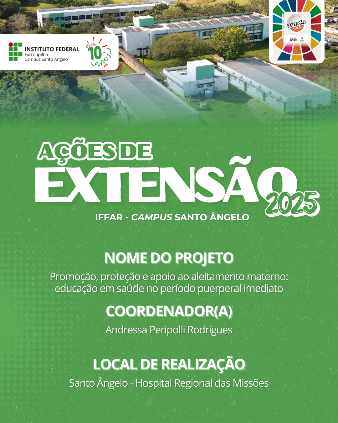 O projeto de extensão “Promoção, proteção e apoio ao aleitamento materno: educação em saúde no período puerperal imediato” teve como objetivo promover, proteger e apoiar o aleitamento materno por meio de orientações direcionadas às puérperas e a seus familiares, contribuindo para o fortalecimento dessa prática, a melhoria de seus índices no município e a redução de intercorrências e desconfortos que podem surgir ao longo do processo de amamentação.