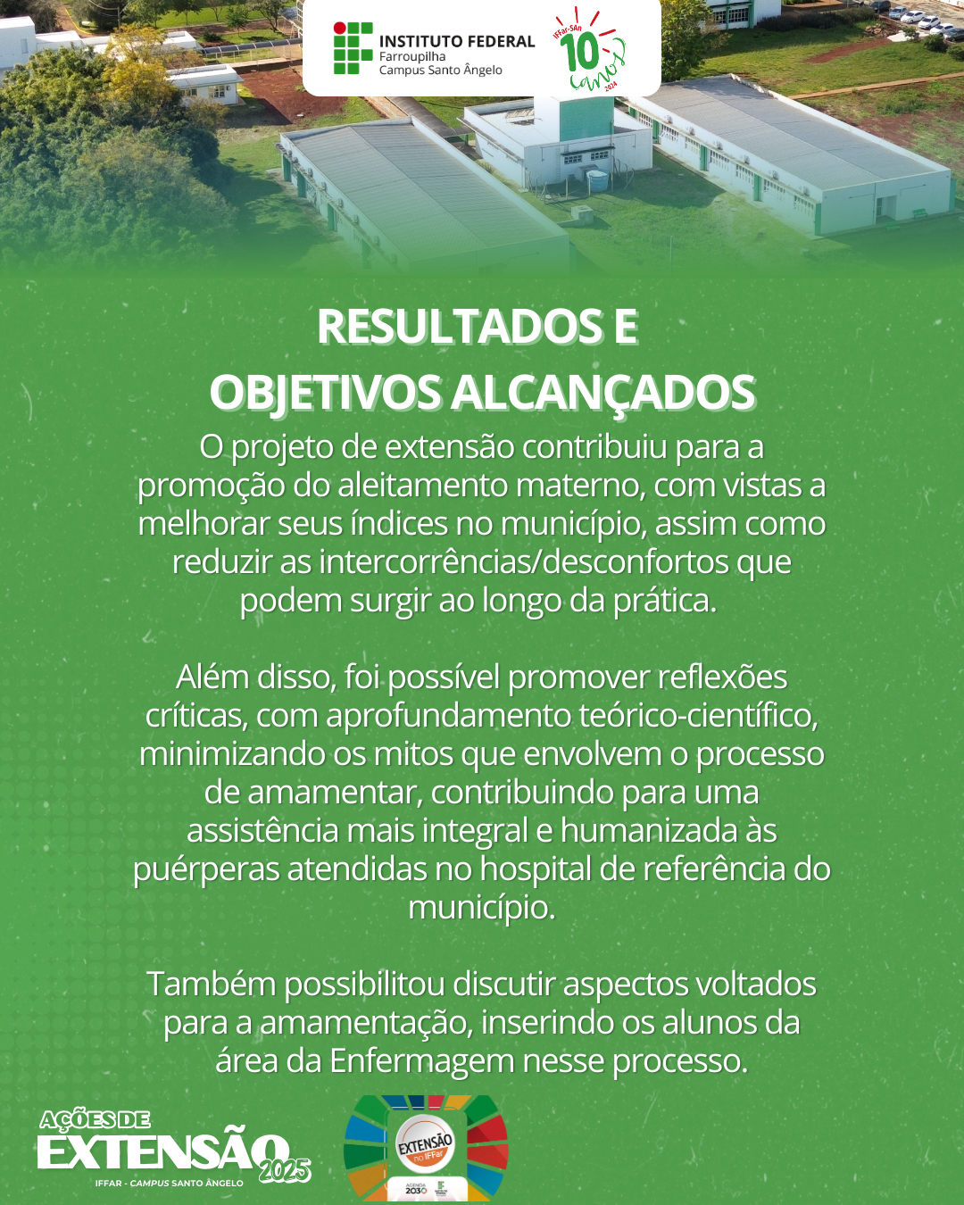 Além do impacto direto na promoção da saúde da mulher e do recém-nascido, o projeto também teve importante caráter formativo, ao inserir estudantes da área da Enfermagem nas práticas educativas e assistenciais relacionadas à amamentação. A experiência contribuiu para a ampliação do conhecimento técnico-científico dos discentes, bem como para o desenvolvimento de uma atuação profissional ética, crítica e comprometida com o cuidado em saúde.