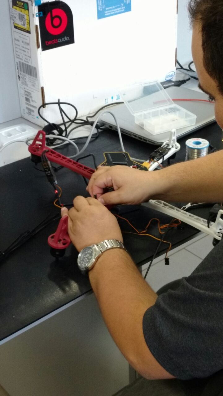 Os alunos Diego Tadeu Santos, Daniel da Veiga e Giovani Bruno Sengbush, do Curso Superior em Sistemas para Internet do Instituto Federal Farroupilha - Campus SantoÂngelo, estão desenvolvendoum drone, veículo aéreo não tripulado e controlado remotamente, coordenado pelo professor Me. Fábio Weber Albiero. O projeto de Pesquisa intitulado: Projeto e Desenvolvimento de Sistemas Interativos através do Uso da Plataforma Arduino, tem como objetivo permitir que os alunos ponham em prática os conhecimentos teóricos adquiridos em sala de aula, como: algoritmos e programação, circuitos digitais, noções de eletrônica e robótica. Pretende-se utilizar este drone para atividades de geoprocessamento, tais como: medição de terras, processamento de imagens capturadas via equipamento, entre outras.
