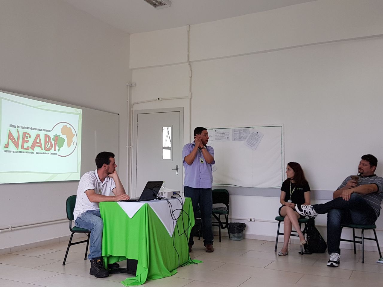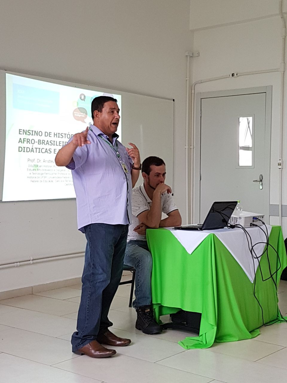 No dia 08 de novembro o Núcleo de Estudos Afro-brasileiros e Indígenas do Campus Santo Ângelo, em parceria com a Coordenação de ações inclusivas e direção de ensino, propiciaram uma formação aos servidores intitulada: “Ensino de História e Culturas Afro-brasileiras: alternativas didáticas e diálogos possíveis” A formação foi conduzida pelo Dr. Aristeu Rocha Castilhos, professor do IFFar Campus de Júlio de Castilhos. Em sua fala, o professor Aristeu apontou a invisibilidade das narrativas históricas indígenas e africanas dos espaços escolares, e destacou a necessidade de uma passagem de um modelo curricular euro centrista para um modelo pluricultural.