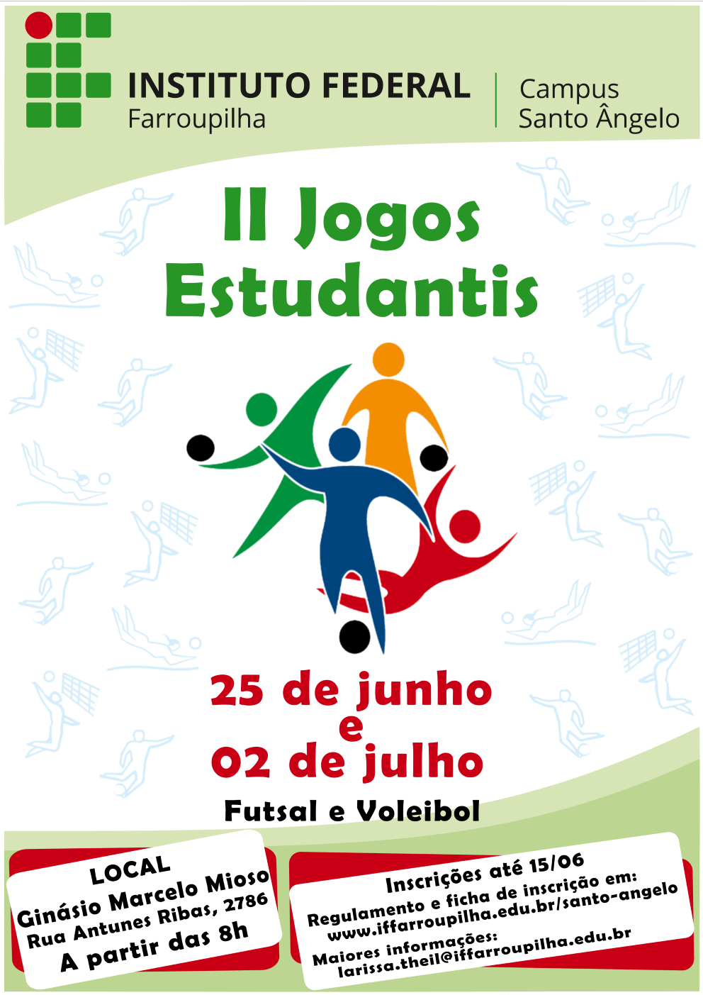O Instituto Federal Farroupilha - Campus Santo Ângelo convida alunos, servidores e comunidade para participar do "II JOGOS ESTUDANTIS" que será realizado nos dias 25 de junho e 02 de julho, a partir das 8h, no ginásio Marcelo Mioso.