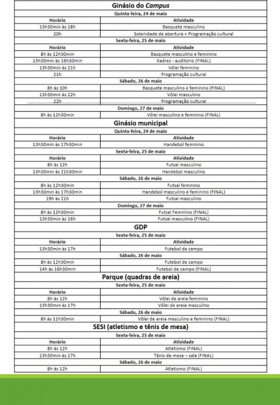 Mais de 500 alunos-atletas de todos os campi do Instituto Federal Farroupilha estarão em Panambi para participar deste grande evento que objetiva promover a integração escolar por meio de práticas esportivas, e o Campus Santo Ângelo organizou sua delegação contendo inscritos em todas as modalidades do evento esportivo, à exceção da corrida de 5000m, sendo importante salientar que esse empenho da equipe acadêmica (discentes e docentes) tem nos trazido sucessivas conquistas e destaques nos mais diversos campeonatos esportivos.
